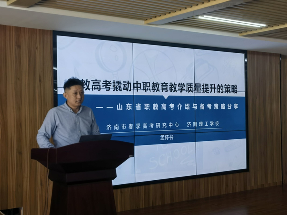 山东理工大学鹿宏教授代表培训基地发言。他表示,济南理工学校在专业建设、师资培养、实训教学、职教高考等方面积累了较为成熟的经验,是本次国家级骨干教师访学研修的实践教学基地之一。此次考察学习既让参训教师直观感受中职办学前沿实践,也为国家级师资培训提供了优质现场教学支撑。