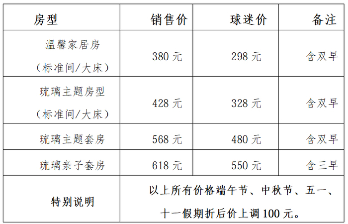 法定节假日:5月1日-5月3日商务房/大床房498元/间(含早),球迷优惠价478元/间(含早);亲子房798元/间(含早),球迷优惠价708元/间(含早)。10月1日-10月5日商务房/大床房498元/间(含早),球迷优惠价458元/间(含早);亲子房798元/间(含早),球迷优惠价628元/间(含早)。