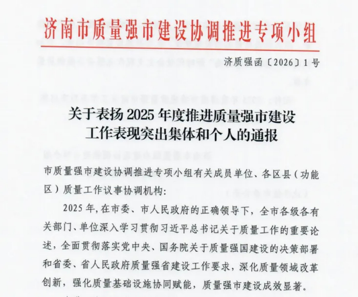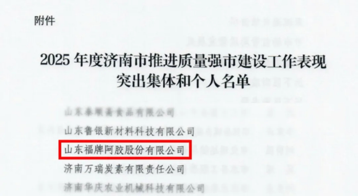 近日,济南市质量强市建设协调推进专项小组发布2025年度推进质量强市建设工作表彰名单,福牌阿胶荣获济南市“2025年度推进质量强市建设工作表现突出企业”。这一殊荣,是对福牌阿胶长期深耕质量建设、以品质驱动高质量发展的有力肯定,更是这家中华老字号在新时代交出的一份亮眼答卷。