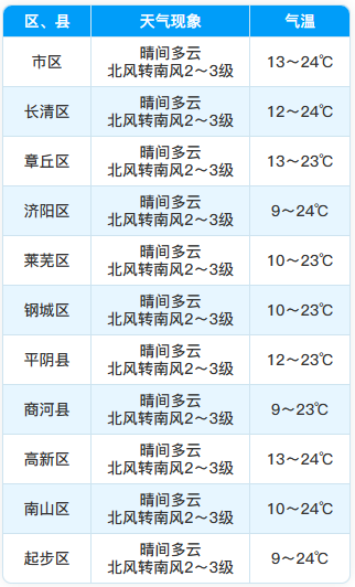 晴间多云,北风转南风3~4级,最低气温市区13°C左右,其他区县9~13°C,最高气温24°C左右。