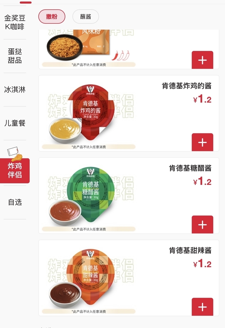 在济南宽厚里肯德基门店,店员向记者详细介绍了最新收费细则。目前肯德基付费调料分为两大品类,糖醋酱、甜辣酱、肯德基炸鸡盒装蘸料,单盒售价1.2元;天府椒麻香辣粉、香菜牛肉风味粉等撒粉类调料,单包售价0.9元,目前番茄酱暂未纳入收费范畴。