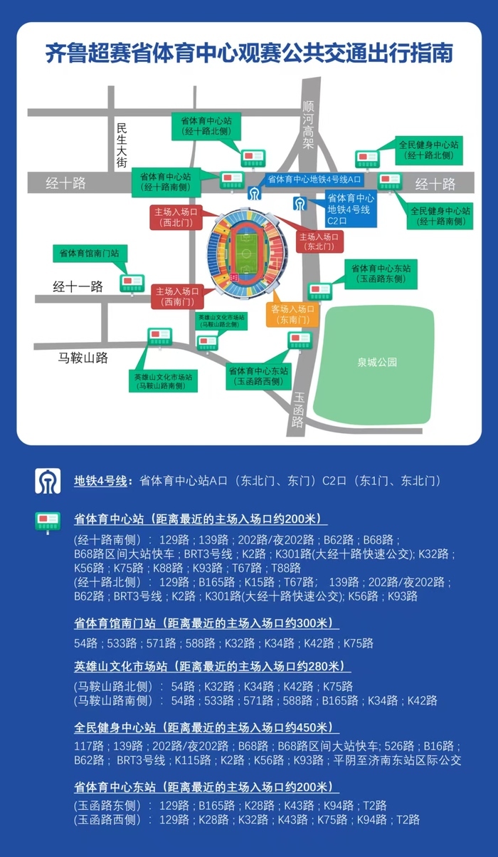 4月25日(本周六),齐鲁超级联赛济南赛区济南队主场VS济宁队,赛事已进入倒计时。记者了解到,本场球赛共设立四大检票口,分别位于体育场的西北门、东北门、西南门和东南门。旨在让观众能够根据自身所在位置和座位区域,选择最近的入口,从而有效减少等待时间,提高入场效率。