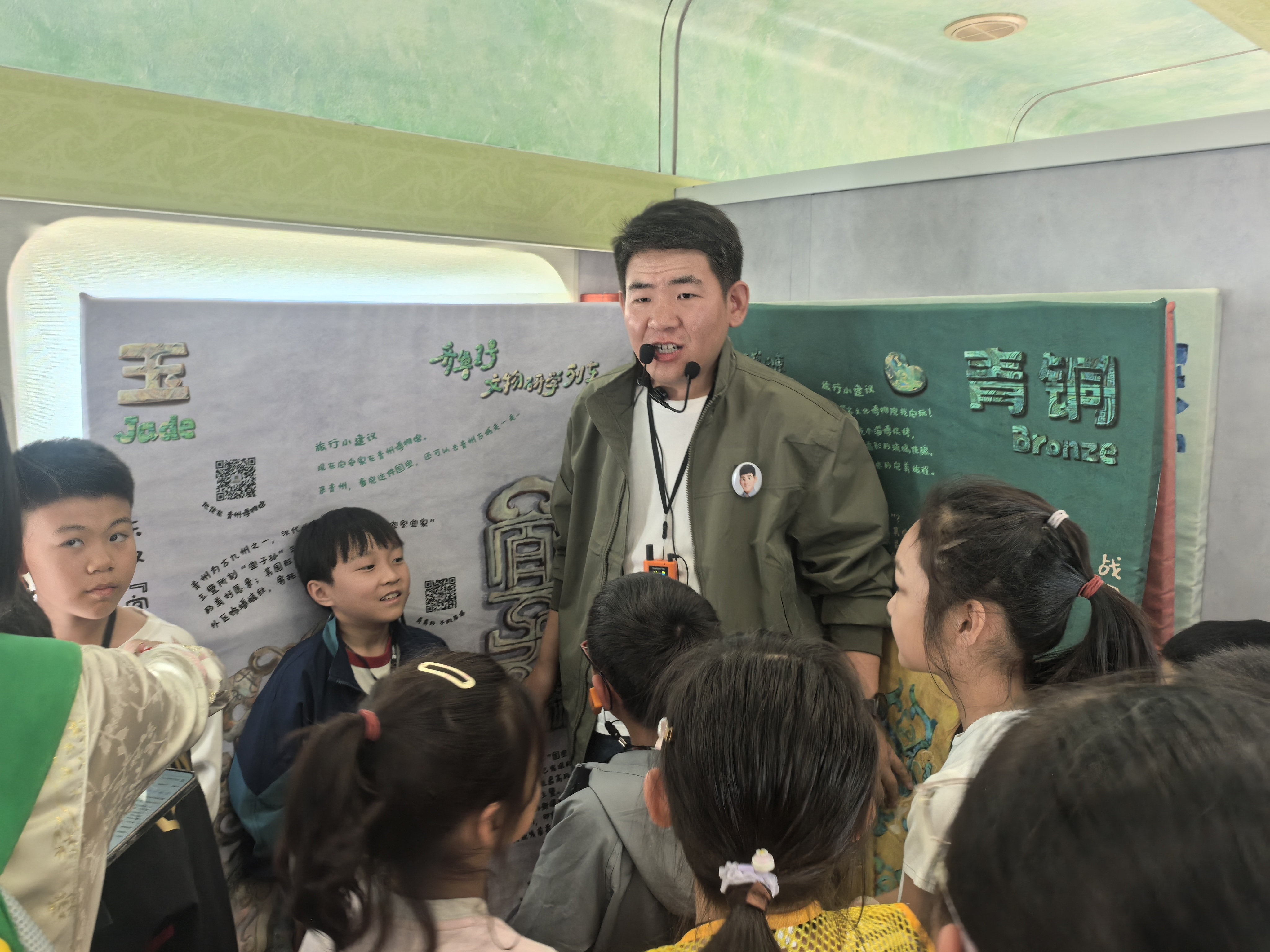 现场,大姚老师的讲解幽默风趣,总能把枯燥的文物知识变成孩子们喜爱的时髦表达。他会将汉画像石与烧烤联系起来,也会从“最贵的小孩儿玩具”讲起,将青州博物馆镇馆之宝宜子孙玉璧的故事娓娓道来……而孩子们天马行空的回答,更将车厢变得妙趣横生。