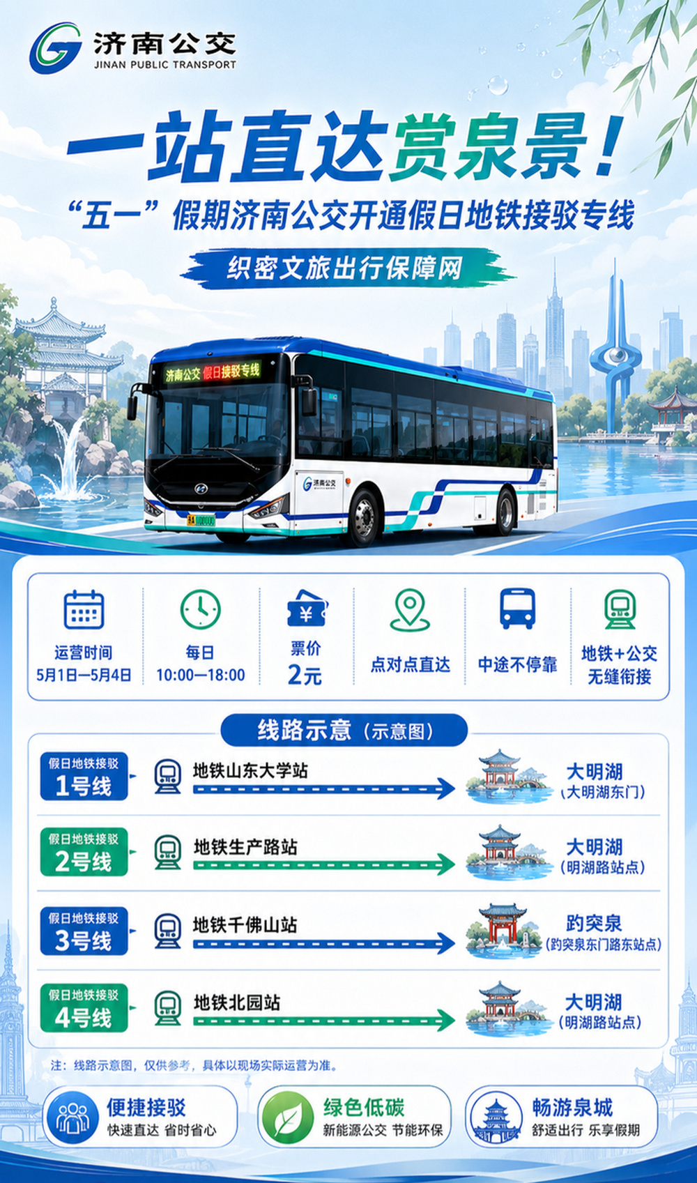 “五一”假期来临,趵突泉、黑虎泉、大明湖等核心景区及周边商圈将迎来客流高峰,济南公交研判客流特点,将开通4条假日地铁接驳专线,采用点对点直达运营模式,中途不设置停靠站点,实现地铁出站口与景区入口无缝连通,大幅缩短游客步行距离,全面提升假日文旅出行体验。