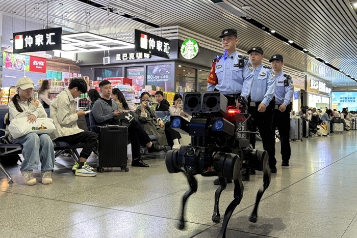 同时,机器狗配备了高清广播系统,在巡逻过程中循环播放反诈、防盗、防猥亵等安全提示,协助民警疏导旅客有序乘降,引导客流快速通行,成为站区安全防控的“移动哨兵”。