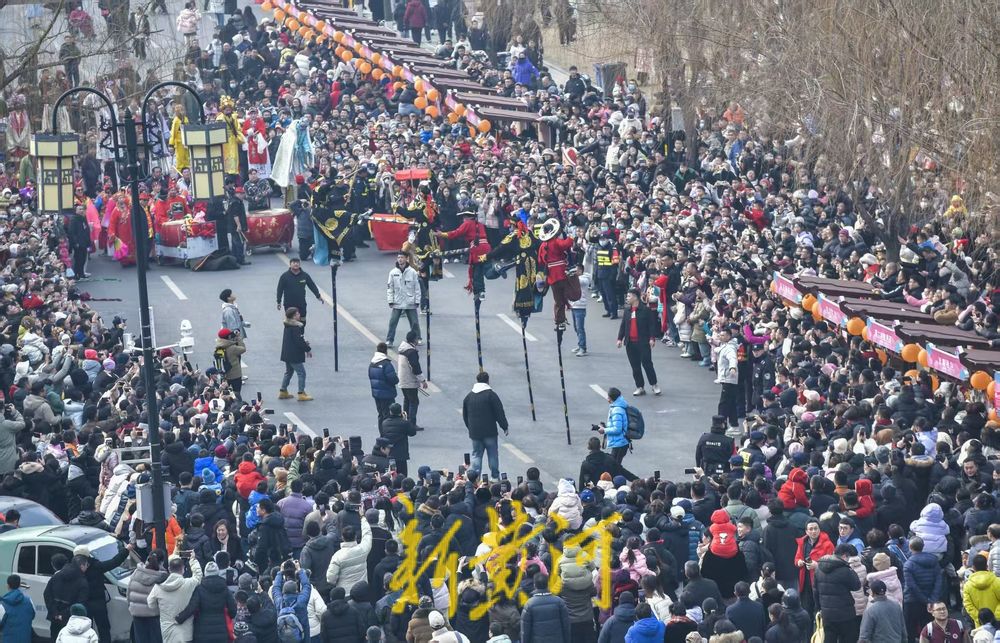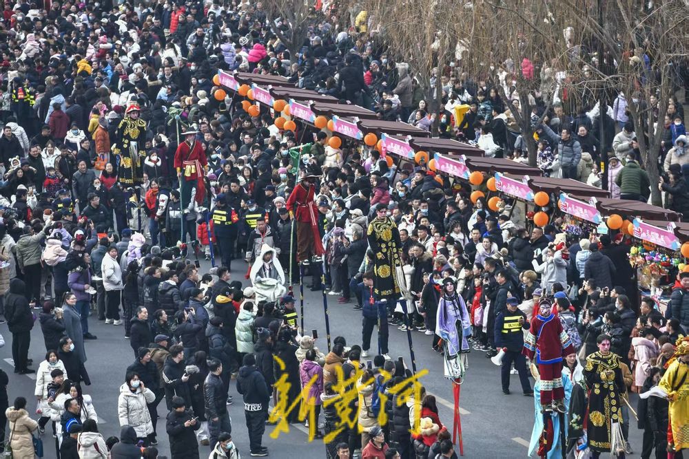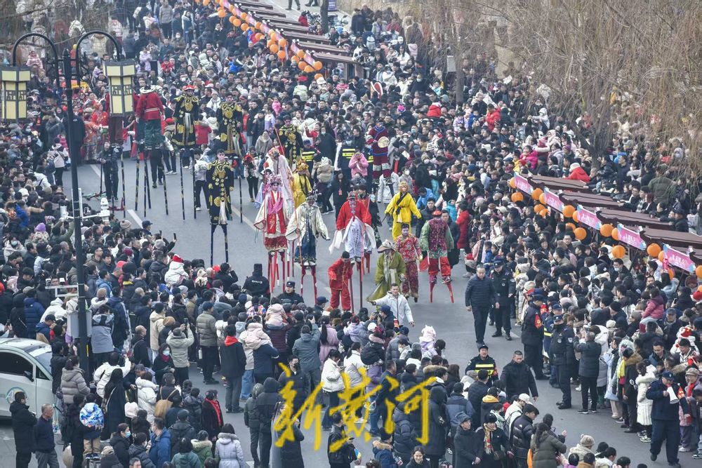 在民俗展演时段,街巷内更是人潮涌动。下午2:30,高跷表演队伍进入市集,表演现场围观的市民是里三层外三层。