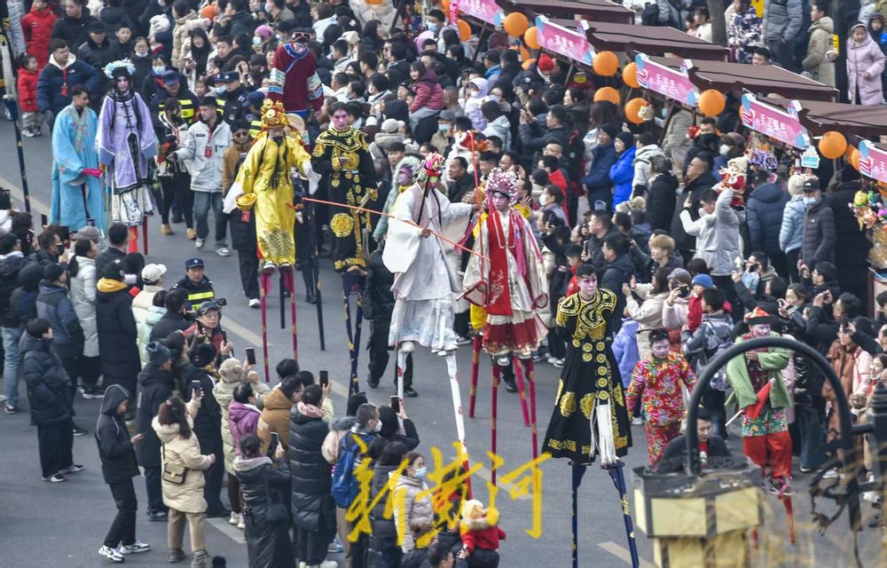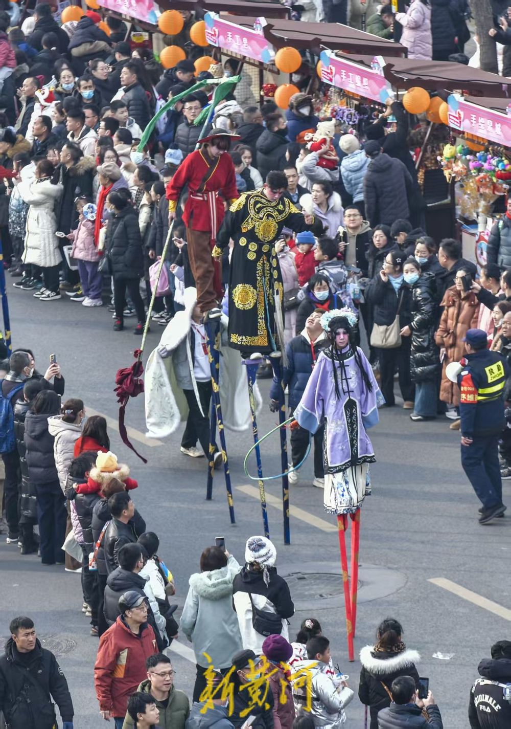 高跷队的队员们踩着1—2米高的高跷,展示各种高跷绝活,营造出浓浓的节日气氛。