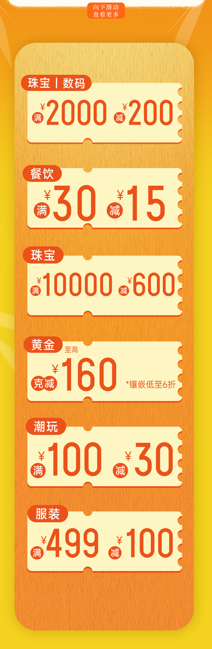 超值满减享不停:珠宝/数码满2000元减200元;餐饮满30元减15元;黄金克减至高160,镶嵌低至6折;潮玩满100元减30元;服装满499元减100元。