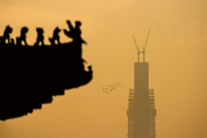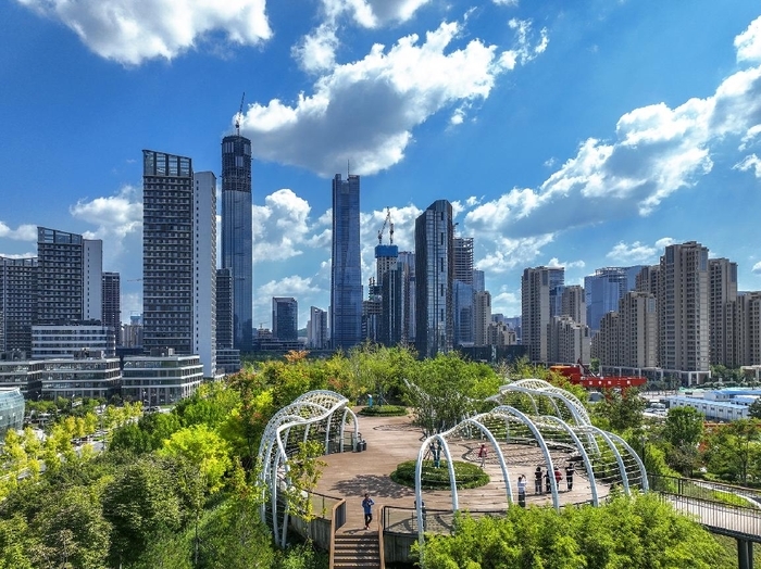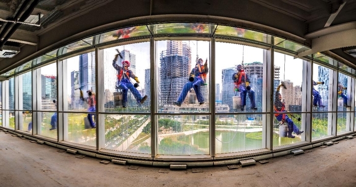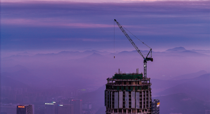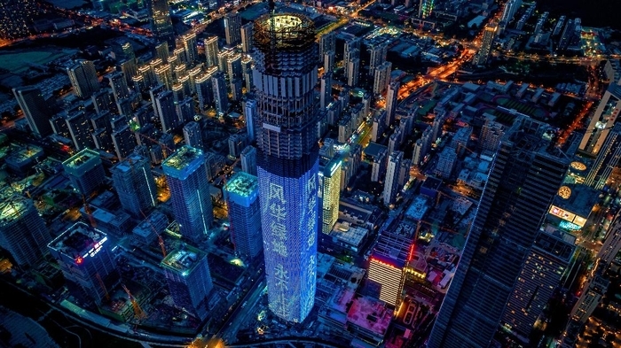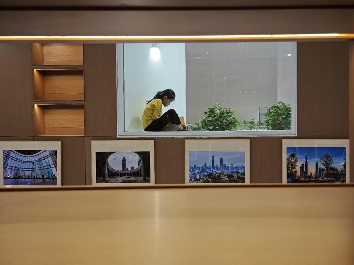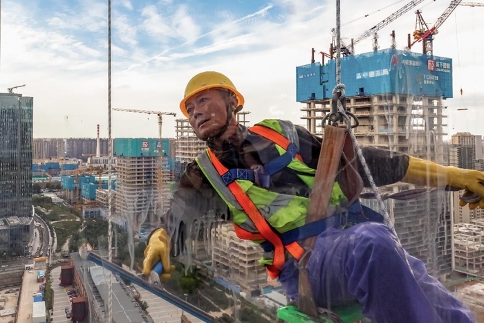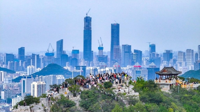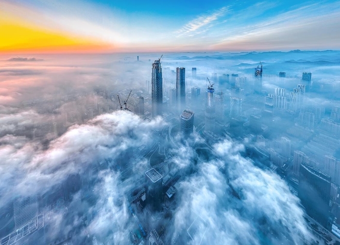 作品《拔节生长》呈现塔吊林立的建设现场;《崛起》《五指山下》等作品以独特视角捕捉超高层建筑群形成的壮丽天际线;《云海》《山歌》等则艺术化再现了“山、泉、湖、河、城”相融合的城市意象。此外,《都市蜘蛛人》《致敬城市美容师》等纪实作品,聚焦城市建设者与城市风貌的日常互动,展现出城市发展背后的人文温度。