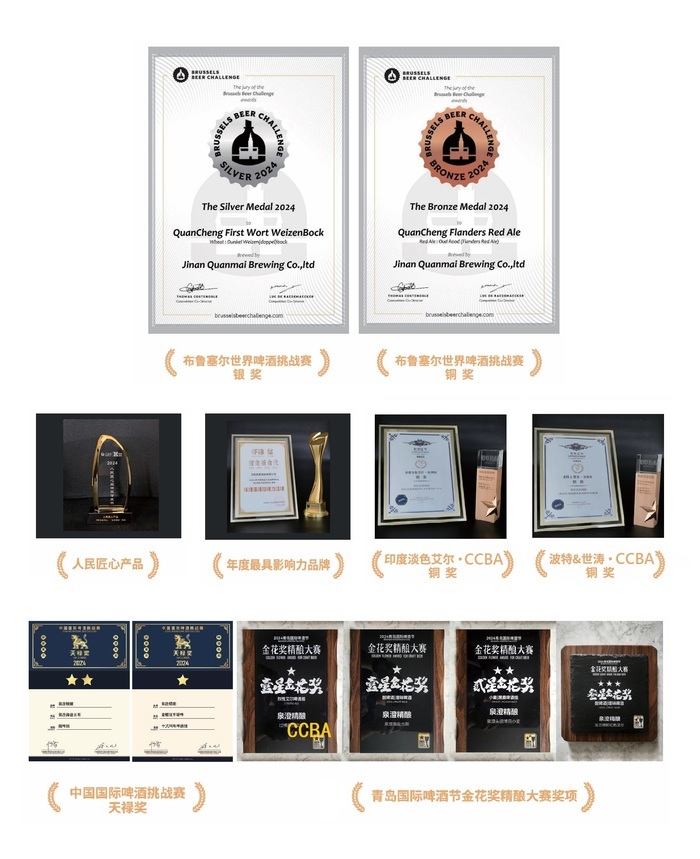 在国内赛场,泉澄精酿更是获奖常客。相继斩获2023年度中国食品工业品牌博览会馥兰德奖“最具影响力品牌”;燕麦牛奶世涛及社交IPA产品获第8届CCBA-中国精酿啤酒大赛铜奖;在2024青岛国际啤酒节金花奖精酿大赛上,“法兰德斯红色艾尔”获大赛最高荣誉“叁星金花奖”,“泉澄头道博克小麦”荣获“贰星金花奖”,“过桶烈性艾尔”、“泉澄海盐古斯”两款产品荣获“壹星金花奖”;在2024中国国际啤酒挑战赛上,“泉澄海盐古斯”及“姜糖红枣暖啤”分别荣获“二星天禄奖”、“一星天禄奖”。