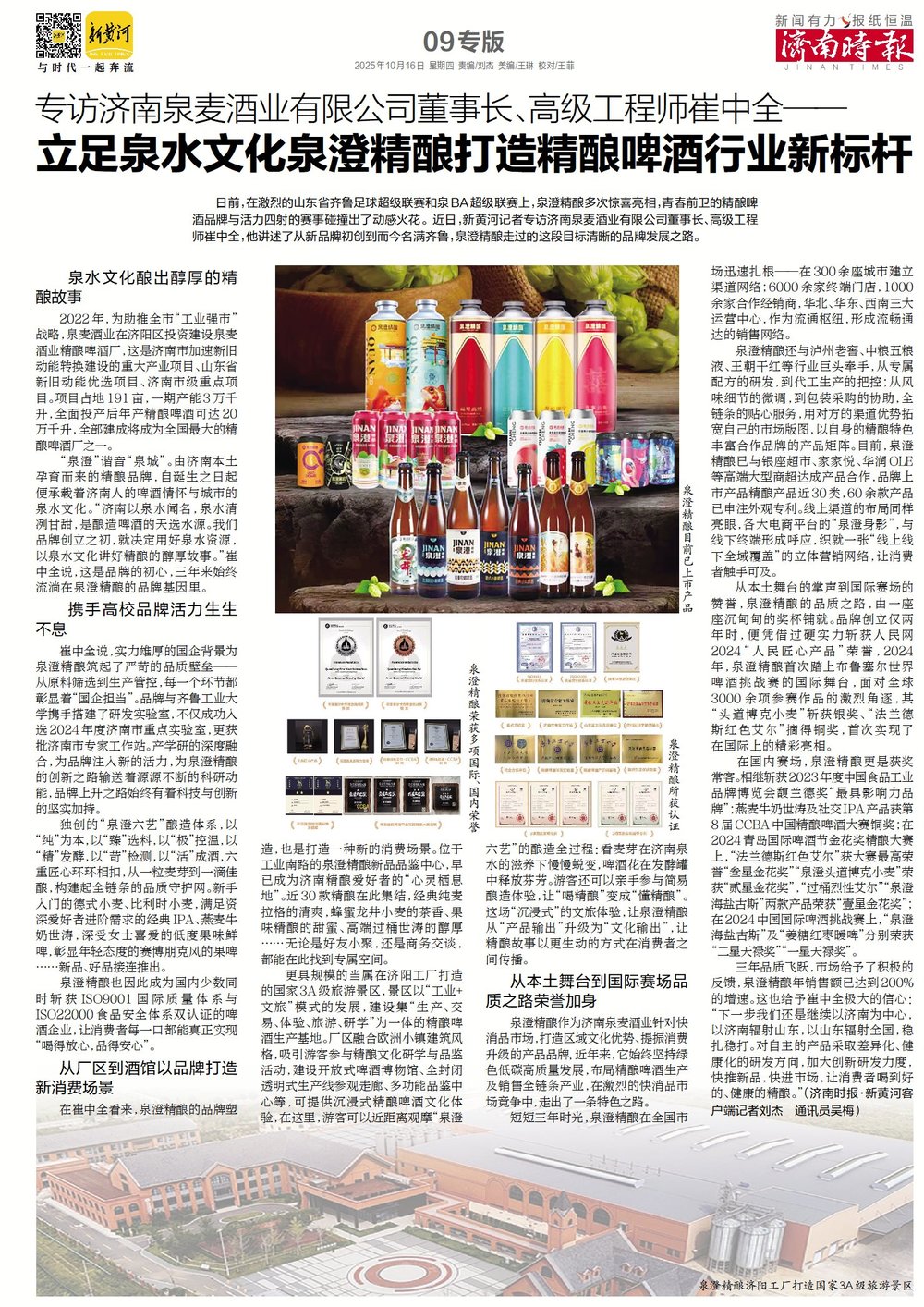 日前,在激烈的山东省齐鲁足球超级联赛和泉BA超级联赛上,泉澄精酿多次惊喜亮相,青春前卫的精酿啤酒品牌与活力四射的赛事碰撞出了动感火花。近日,新黄河记者专访济南泉麦酒业有限公司董事长、高级工程师崔中全,他讲述了从新品牌初创到而今名满齐鲁,泉澄精酿走过的这段目标清晰的品牌发展之路。