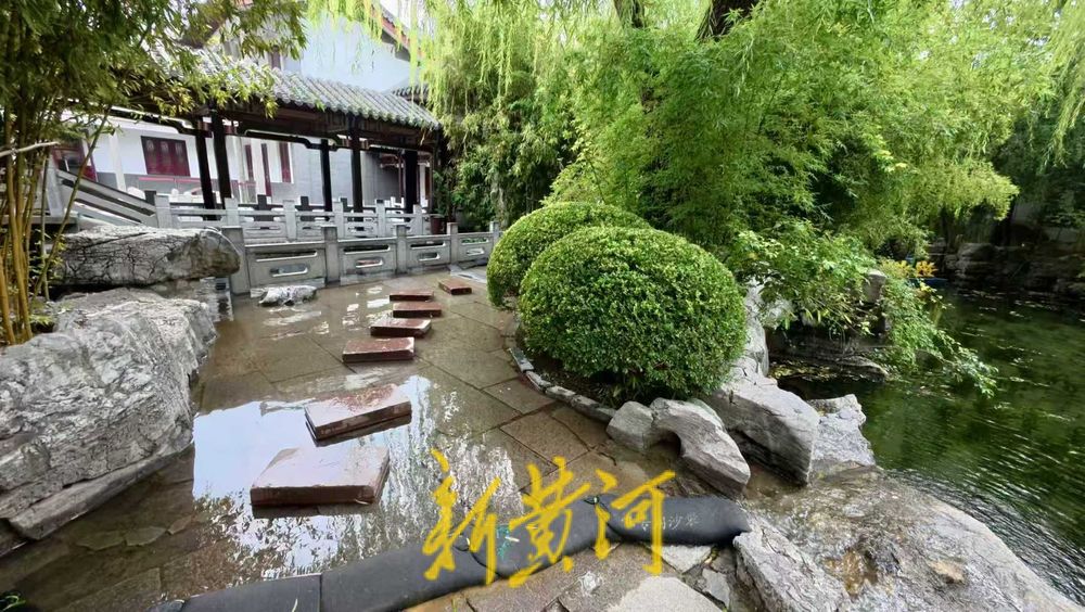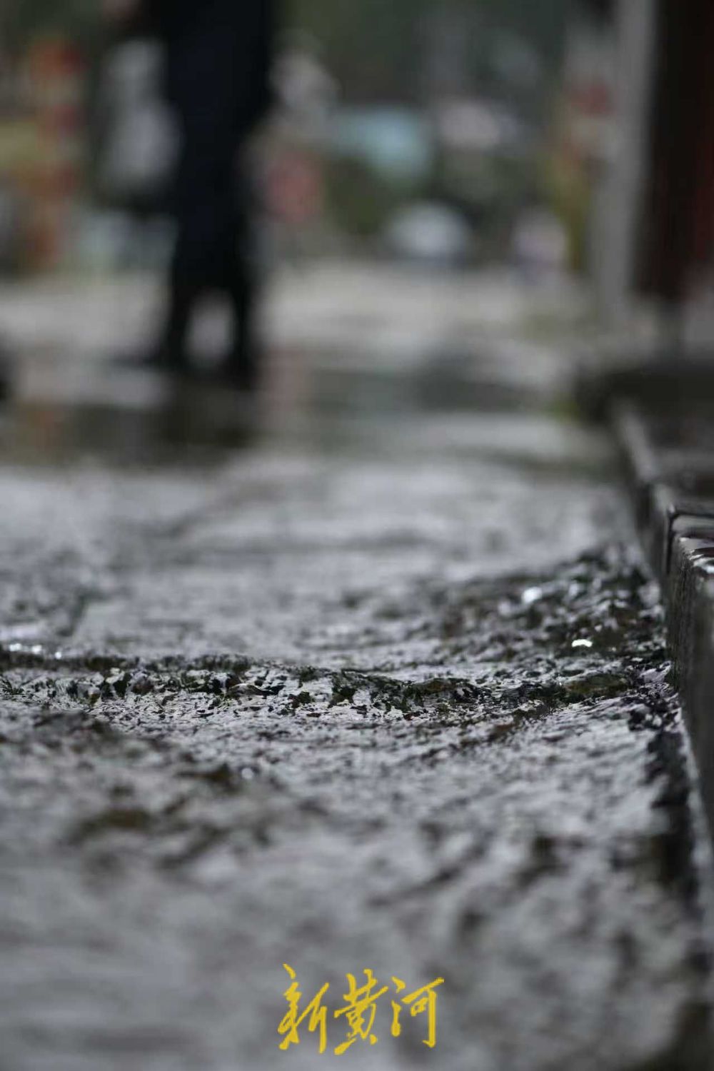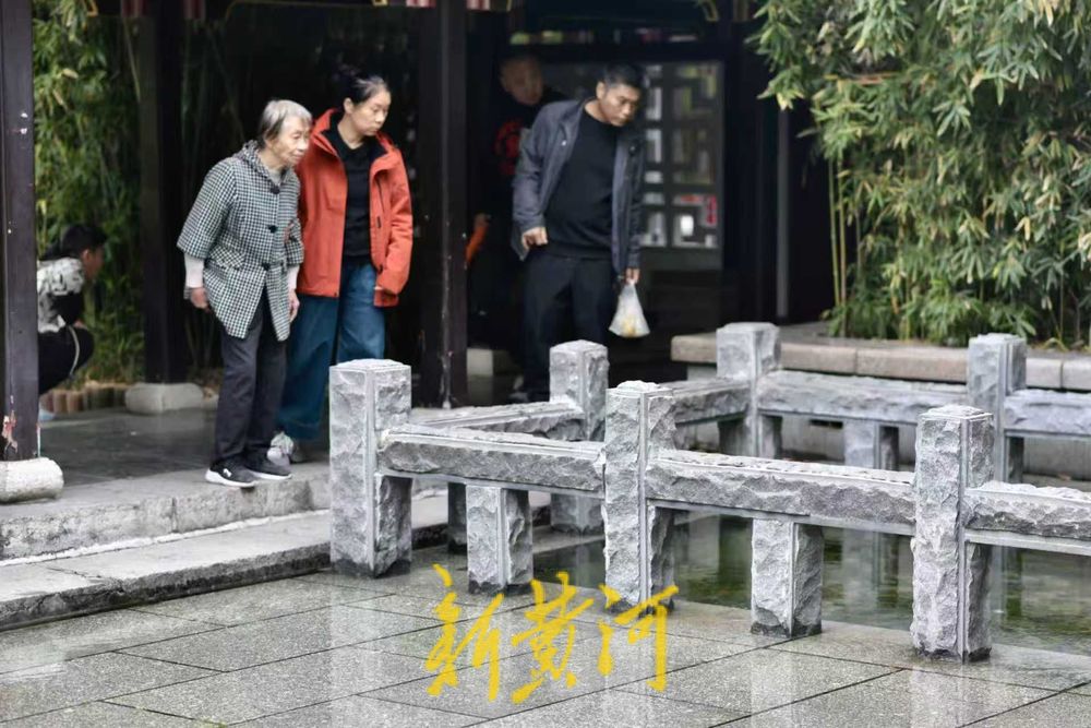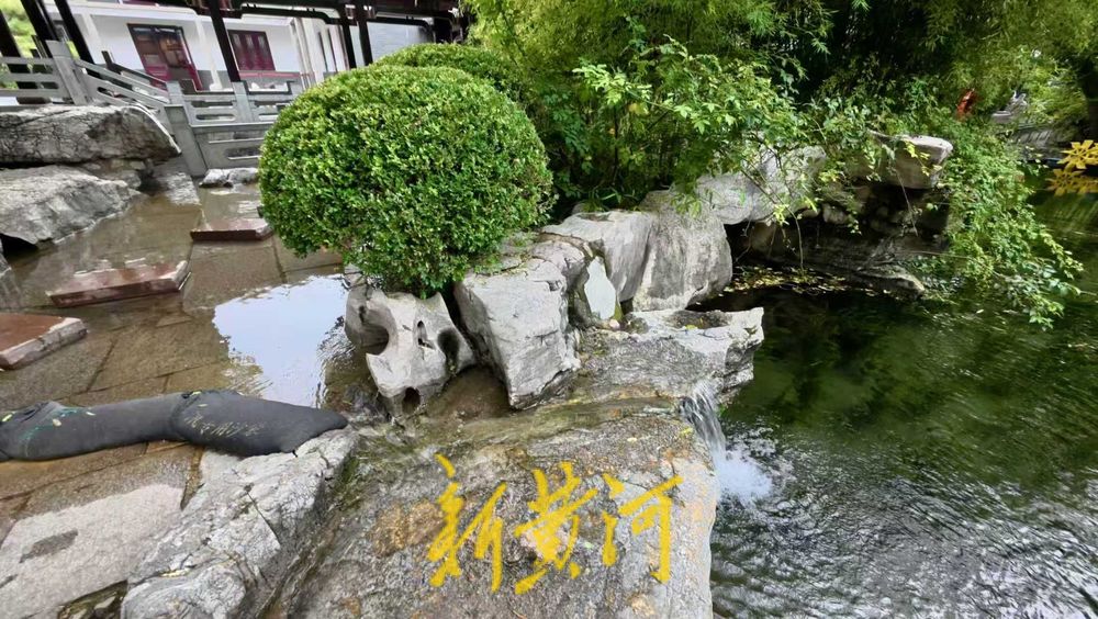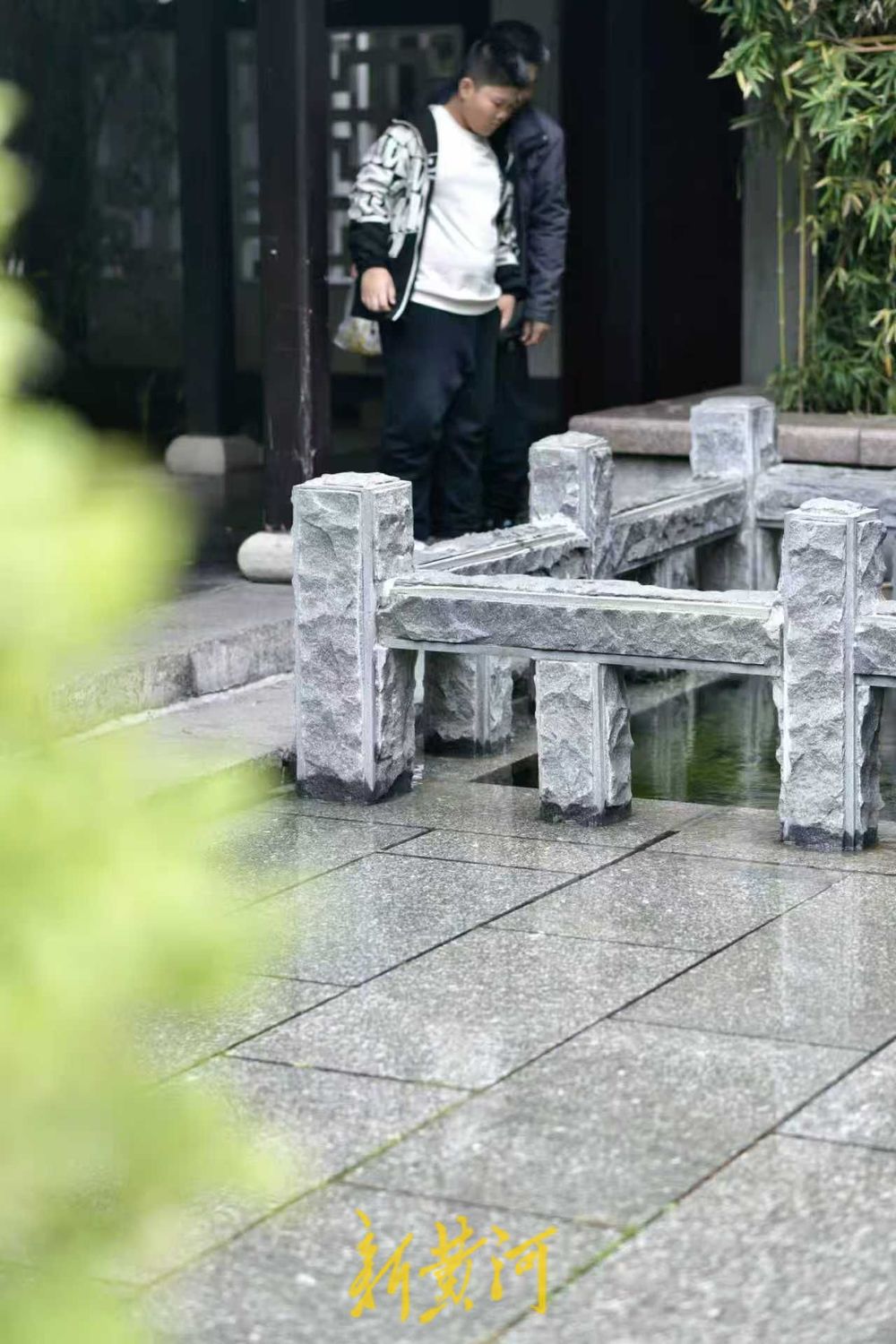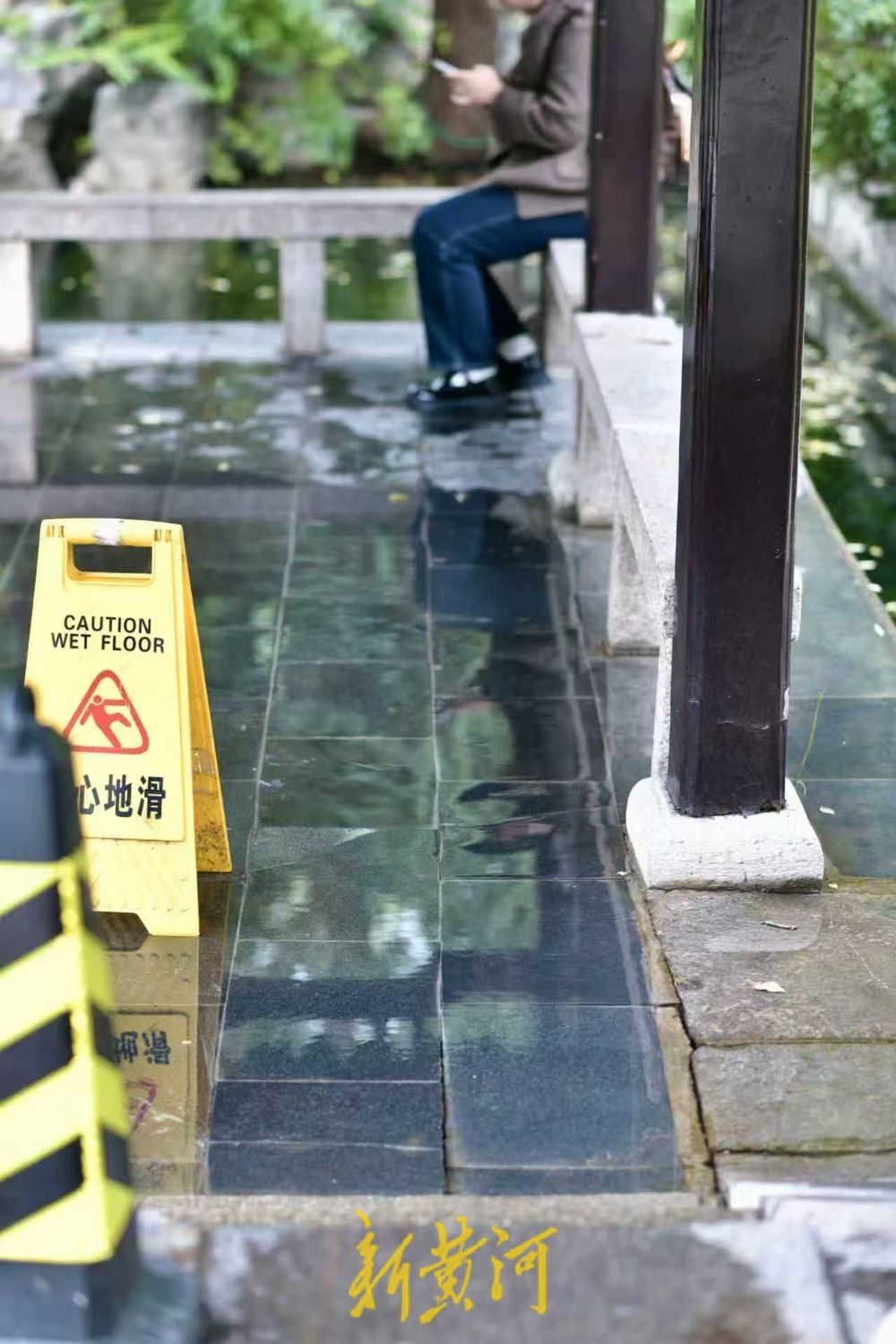 园区工作人员在路面铺设了石板,方便游客通行,同时设置了挡水沙袋,将石板路流淌的清泉引入附近的泉池。