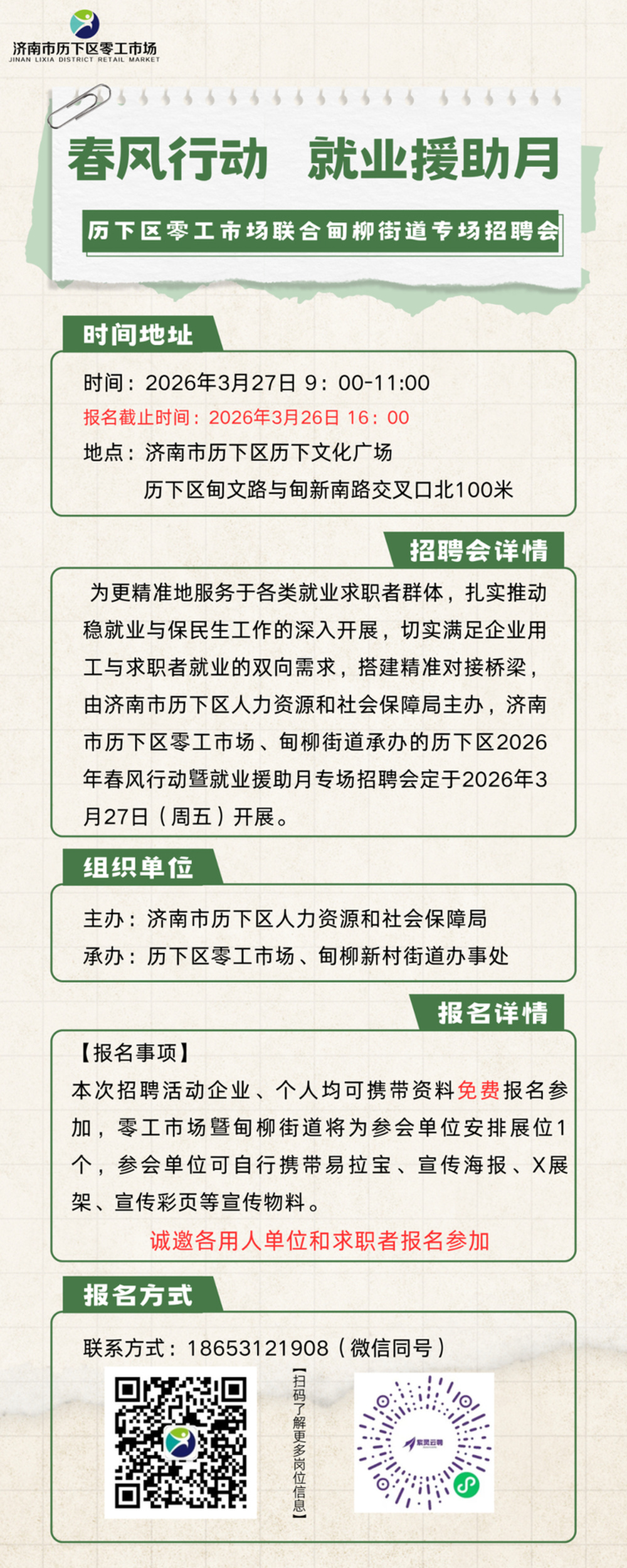 为更精准地服务于各类就业求职者群体,扎实推动稳就业与保民生工作的深入开展,切实满足企业用工与求职者就业的双向需求,搭建精准对接桥梁,由济南市历下区人力资源和社会保障局主办,济南市历下区零工市场、甸柳街道承办的历下区2026年春风行动暨就业援助月专场招聘会定于2026年3月27日(周五)上午9:00—11:00开展。