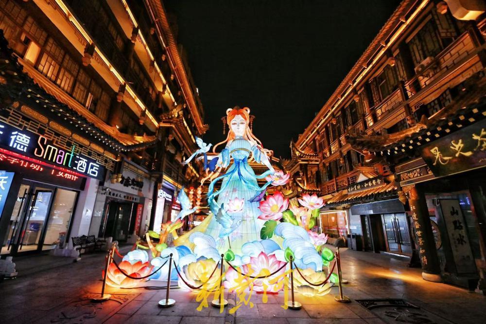 三大主题灯组串联起传统美学与现代创意,将泉城夜色装扮得更加亮丽。《山海经》原型的 “九霄游鳌” 灯组鳞甲闪耀,暗含“独占鳌头”的新年祈愿;“龙鱼载姝”将祥瑞龙鱼与典雅仕女相融合,刚柔并济的造型自带“出片滤镜”;“碧荷仙姬”灯组则以荷塘月色为幕,仙子与莲荷相映成趣,恰似“荷风送香气”的诗意画卷。