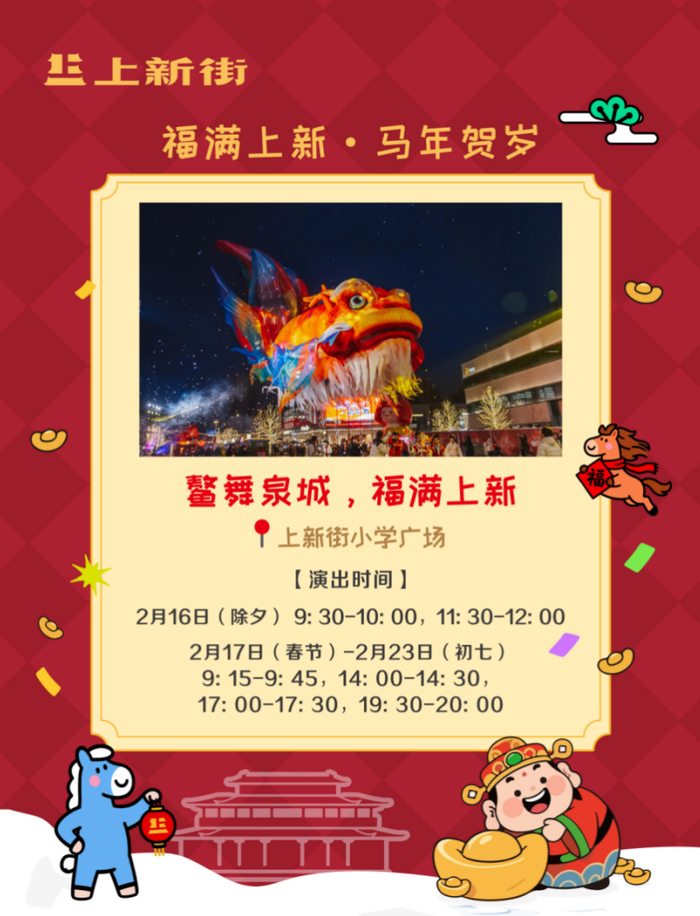 新春将至,年味渐浓。济南城市发展集团所属城市更新项目精心打造的2026年“四戏连台 马到功成”新春系列活动已拉开帷幕。作为活动的重磅亮点之一,位于上新街的巨型空飘鳌鱼即将于2月16日(除夕)正式展出,与市民游客共迎马年新春。