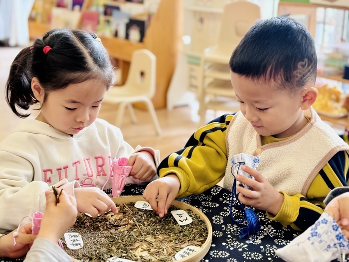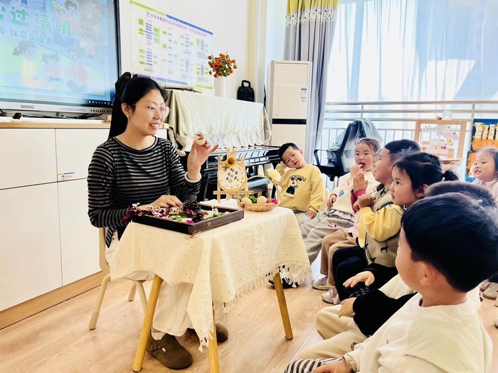 同样是在这个节气,更小的孩子用更童趣的方式感知春天。在槐荫区礼乐佳苑幼儿园清源分园,小班孩子编柳帽、做艾草香包、放飞手绘风筝;中班制作花草蛋和纸杯风车,一个孩子指着转动的风车说:“风有形状,你看,它的叶子在跳舞。”大班孩子则画“烟雨清明”、做竹笼青团。老师告诉他们,那朵皱纹纸菊花,可以送给想念的人。