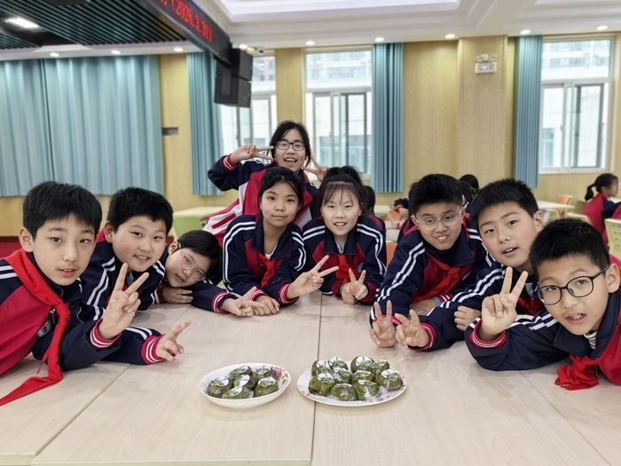 “下次我要做给爸爸妈妈吃。”一名学生咬了一口自己做的青团,笑着说。