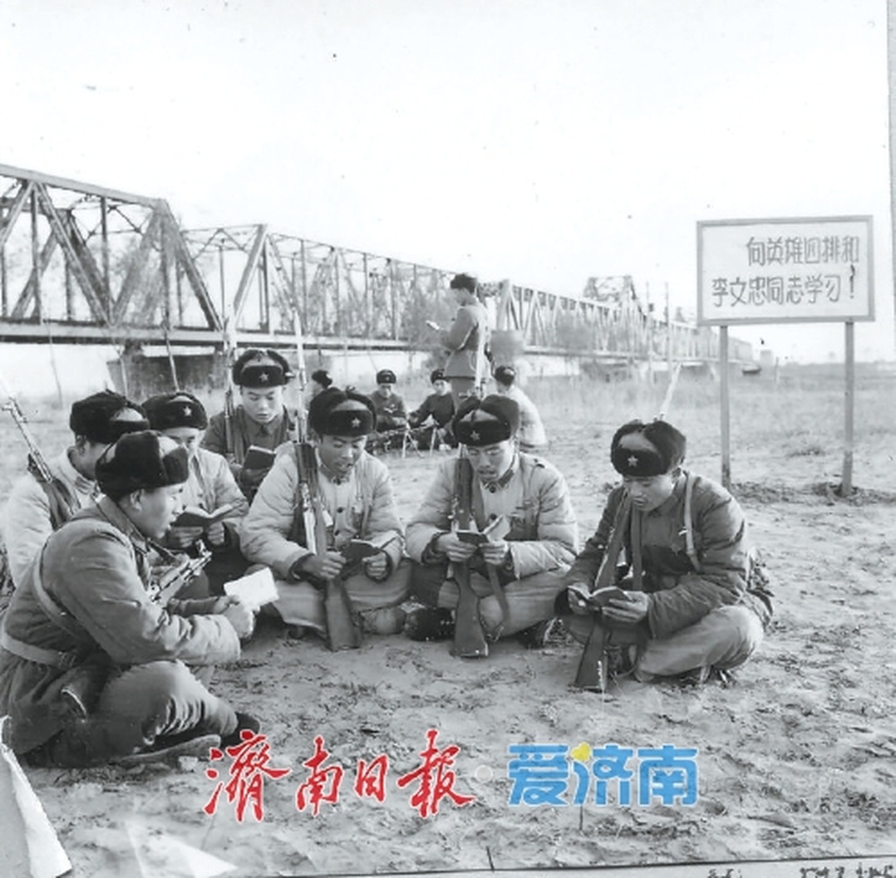 20世纪60年代,护桥民兵在泺口黄河铁路大桥下学习英雄事迹。