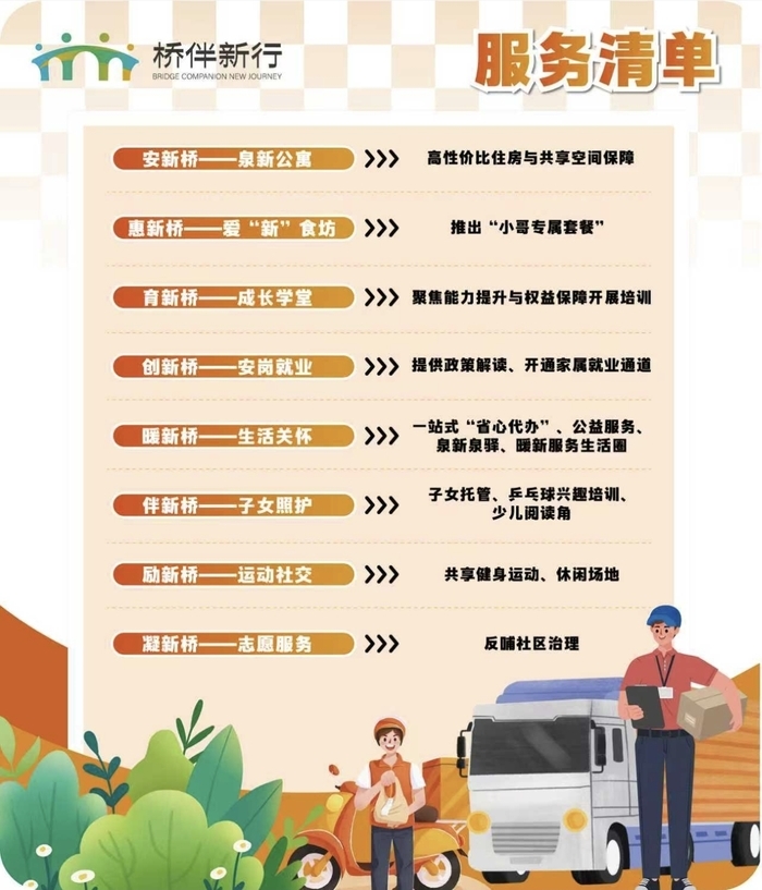 持续优化全域暖心服务体系。坚持以“泉新公寓”为核心阵地,聚焦新就业群体诉求有渠道、困难有人帮、权益有保障、提升有路径、情感有共鸣,多措并举做实常态化关爱服务。建立诉求闭环处理机制,线上分类组建联系群组,线下定期开展“小哥夜话”等活动,完善“收集—交办—反馈—回访”处理链条,及时感知群体动态、解决急难愁盼。做实暖心关爱服务,广泛链接群团组织及社会资源,提供涵盖权益保障、成长赋能、联谊交友等多维度服务,打破部门壁垒、优化服务供给。扩大阵地凝聚效应,依托公寓入住小哥、站长(骑士长)、运营平台负责人等,有效扩大公寓活动覆盖面、提升活动参与度,让公寓成为新就业群体想来、愿来、常来的暖心家园。