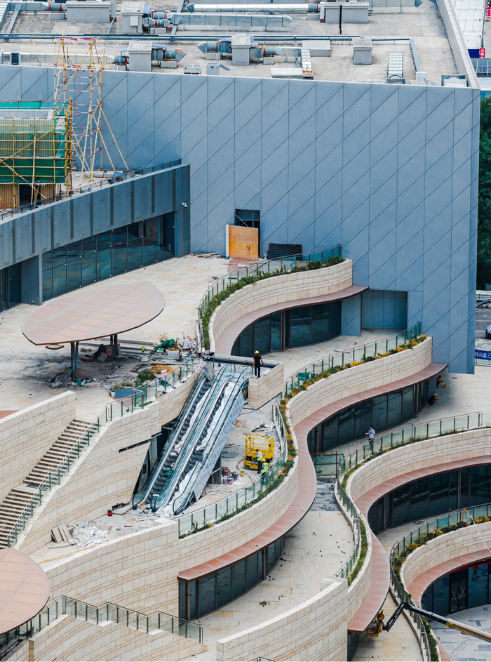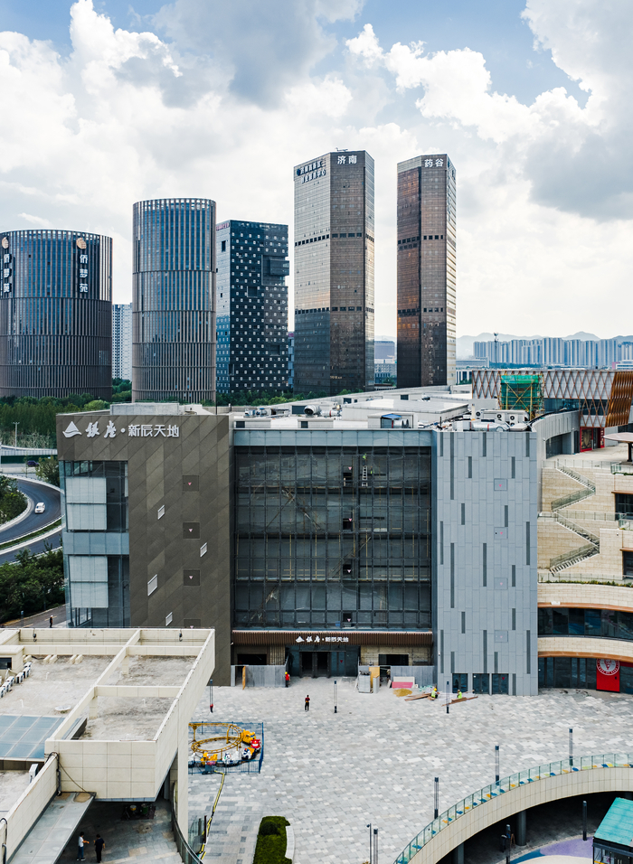 作为银座集团在济南东部的战略力作,银座·新辰天地给自己的定位是年轻潮流型的时尚购物中心。初次踏足银座·新辰天地项目现场,往往都会先被其广阔的户外空间震撼——商场北侧的一层层楼台宽阔而舒展,向两翼张开,且并非传统楼台那样上下对齐、一层压一层的方正设计,而是呈现出梯田一样的错层退台式效果,还巧妙融合了看台式的下沉广场与屋顶花园的半开放式设计,这在中国北方的商业体中尤为罕见。
