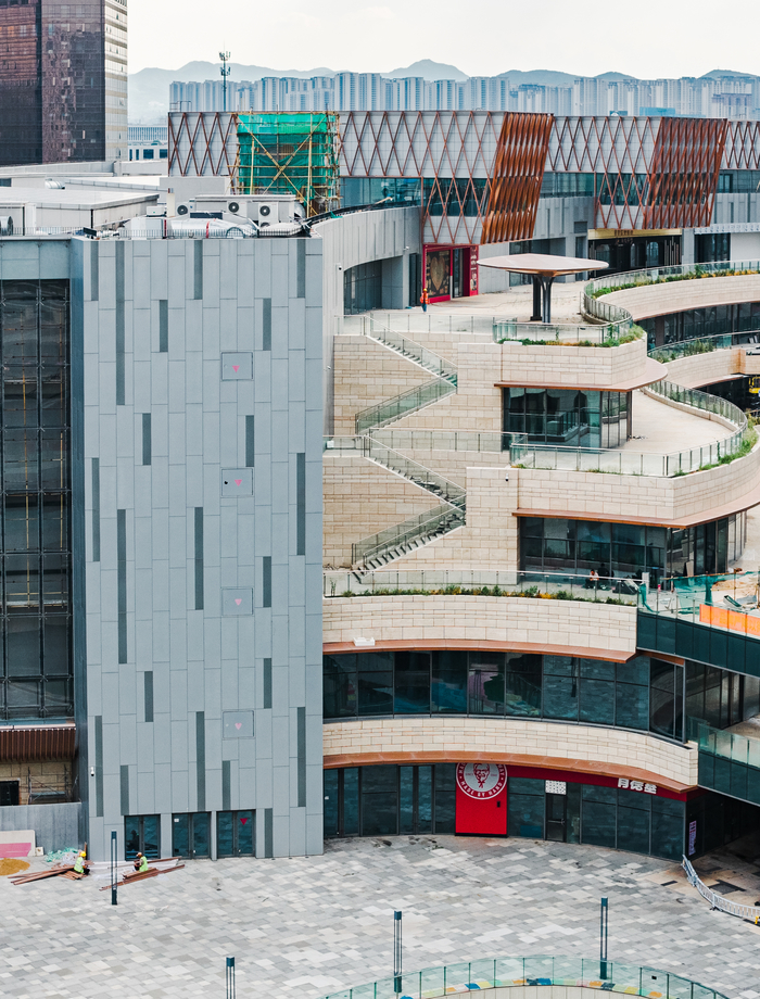打破传统商场封闭“盒子”形态,采取北方罕见的“梯田式”退台设计