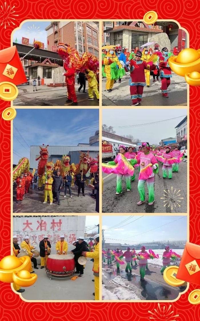 除此之外,大冶、东鹅庄等村的扮玩活动同样精彩,堪称一场盛大的文化盛宴。扮玩队伍踏着紧凑激昂的鼓点,从村委出发,沿着村庄主干道巡游。锣鼓、舞龙、扭秧歌、梁山伯与祝英台等角色扮演、抬花轿、骑毛驴、划旱船、丑角、大头娃娃等本土特色民俗表演轮番上演,为大家献上了雅俗共赏、老少皆宜的精彩节目。