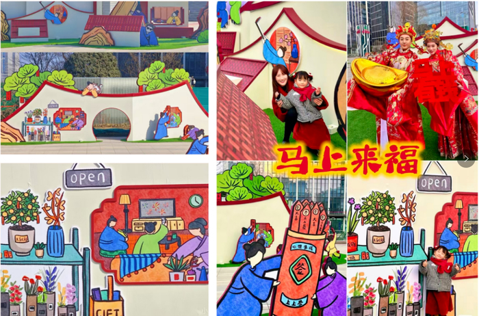 作为中心区商业的核心载体,2月—3月,汉峪金谷峪悦里于A1黄河广场推出“上马·好运季”主题系列新春活动,深度融合“新年美陈+沉浸互动+趣味游园”三大元素,以漫画国风韵味传递新春喜乐,着力打造立体化新春体验氛围。其中,“游园妙会”中国风系列新春美陈已正式落地,一步一景皆蕴古韵,同步配套开展的“马上来财财神互动”系列活动,更是实现了美陈观赏与互动体验的双向赋能。活动期间,财神NPC惊喜现身美陈打卡核心区域,现场派送红包彩票与新春祝福,搭配非遗拓印体验,让市民在趣味互动中直观感受到了传统民俗魅力。