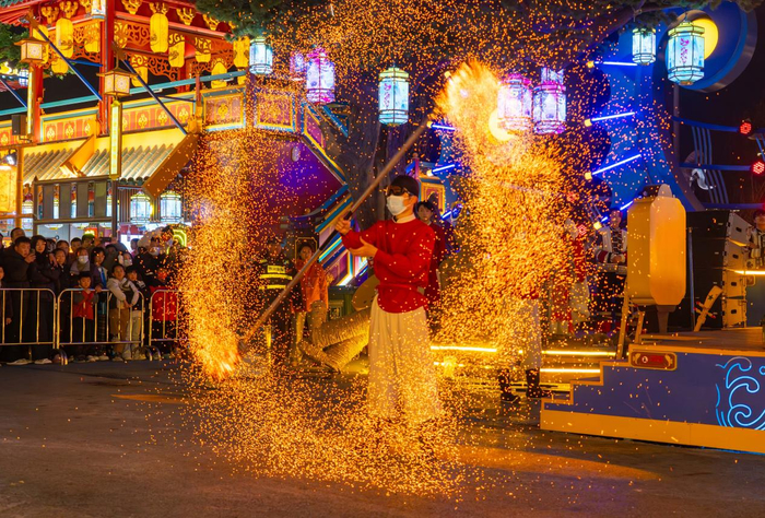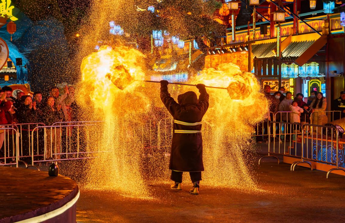 跨年夜当晚,街区以“一夜阅尽九省风华”为核心理念,将沿黄九省(区)的特色文化转化为可感知的沉浸式体验。青海索隆舞、山西团扇舞等非遗方阵沿街巡游,演员邀请游客共舞合影;16米高的“鲤鱼跃龙门”雕塑与“黄河大船”广场的舞剧表演,将神话传说与地域文化具象化。而当非遗打铁花在夜空中绽放出1600℃的“金色星雨”,火壶、火舞等火焰艺术秀与电音派对同步开启,传统技艺与现代潮流的碰撞,让跨年仪式既具历史厚重感,又充满青春张力。