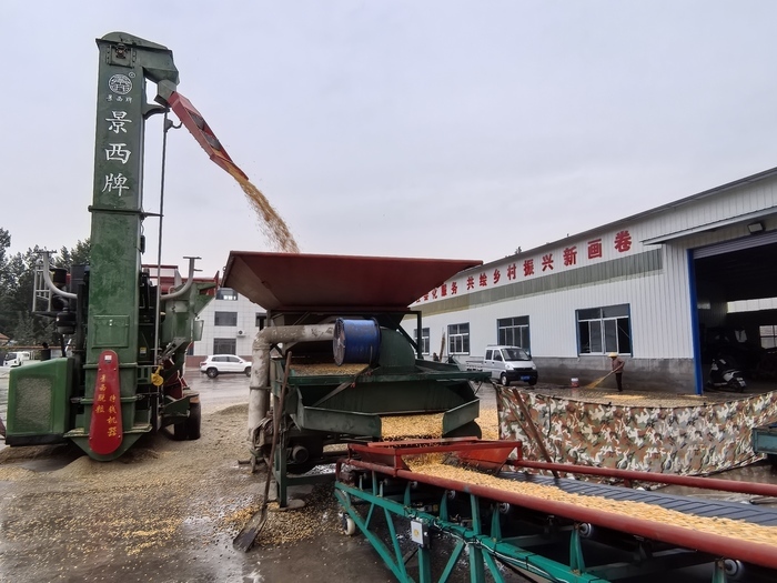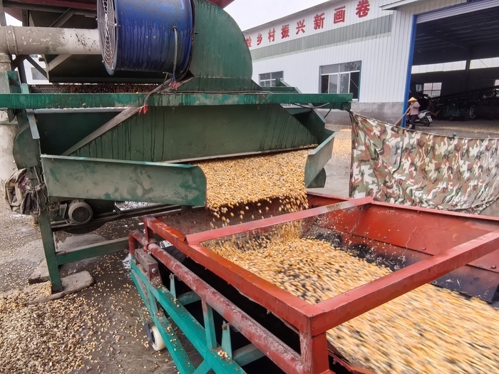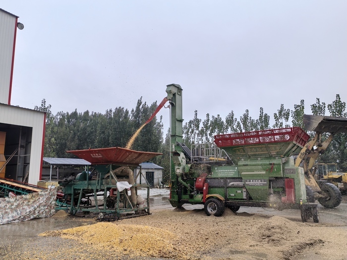 10月10日,在位于方下街道亓官庄村的帮禾农机合作社内,一派火热的忙碌景象。工人正忙着整理玉米,理事长张希伟正熟练地驾驶铲车将玉米粒送入脱粒机。“现在的玉米含水量高,杂质不好去除,影响机器运转,我就想了个办法,先用脱粒机去一遍杂质,再送进烘干塔烘干。”他向记者介绍道。