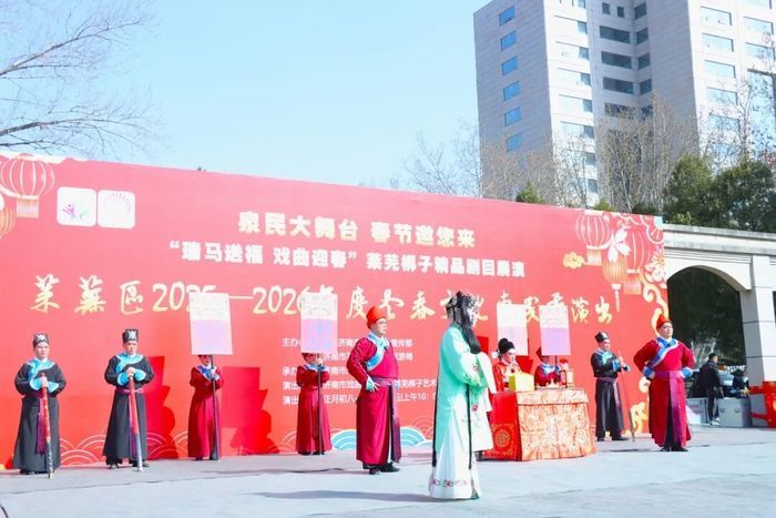 为满足人民群众日益增长的精神文化需求,不断丰富人民群众的节日文化生活,全力营造喜庆祥和、团结奋进的节日氛围,2月24日上午,由中共济南市莱芜区委宣传部、莱芜区文化和旅游局主办,莱芜区文化馆承办,济南市戏曲曲艺中心莱芜梆子艺术传承保护中心演出的“瑞马送福 戏曲迎春”莱芜梆子精品剧目展演莱芜区2025—2026年度冬春文化惠民季演出活动在红石公园T型舞台精彩启幕。