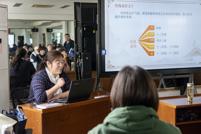 讲座中,卢星医师围绕四大核心板块展开讲解,将专业经络知识转化为老年学员易理解的通俗表达。她首先阐释经络的本质是人体气血运行、脏腑联系的“调控通道”,详细拆解十二经脉的命名逻辑。在经络组成名词解析环节,卢星医师追溯阴阳概念的历史渊源,通过《黄帝内经》《管子》等经典引文,生动解读阴阳对立制约、互根互用等六大关系,结合二十四节气变化、寒热转化等生活实例,让抽象的哲学概念变得具象可感。她还对比五脏六腑特性,为后续经络应用奠定基础。