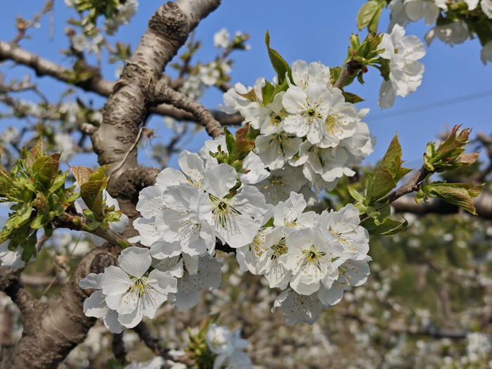 素雪漫山间,寻芳恰此时。踏入田野,映入眼帘的是另一番天地,漫山遍野的樱桃花如云似雪,层层叠叠,素雅芬芳,将春日装点得温柔如画。