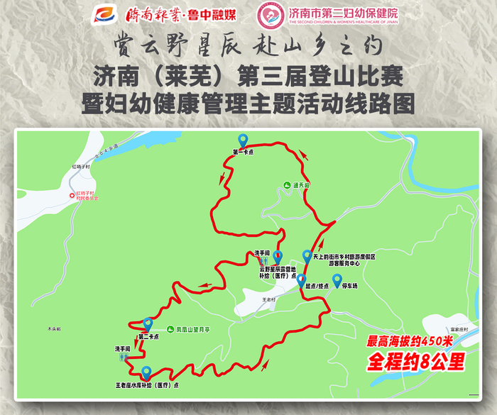 登山赏景,一步一诗!济南(莱芜)第三届登山比赛暨妇幼健康管理主题活动8公里环形赛道正式揭晓,赛道串联“天上的街市”核心景观,让选手在竞技中沉浸式领略莱芜山水与乡村人文之美。