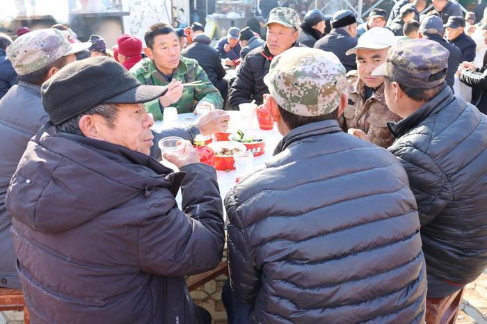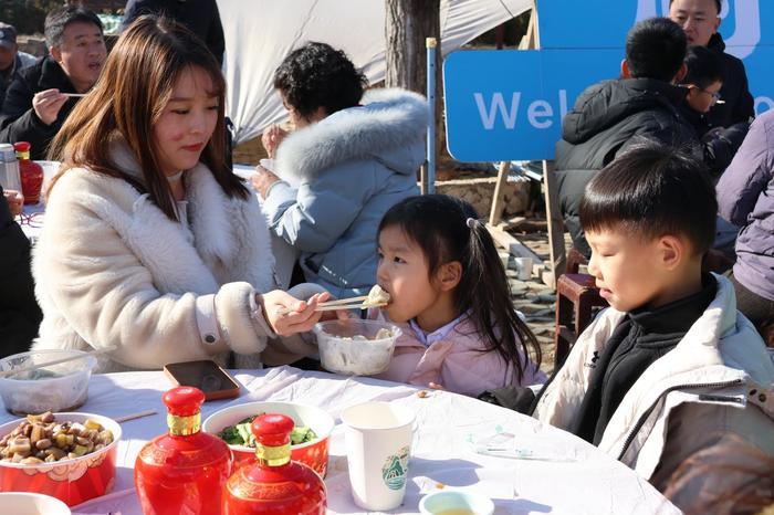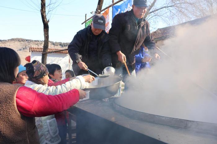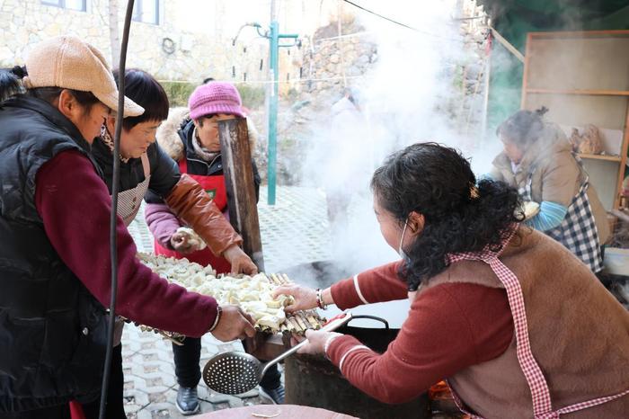 正午时分,大铁锅炊烟袅袅,浓郁的饺香裹挟着山野气息弥漫开来。86岁的村民王方礼早早来到现场,他笑着说:“去年的饺子宴我也来了,去年只有水饺,今年不仅饺子管够,还有好酒喝,日子是越来越红火了!”