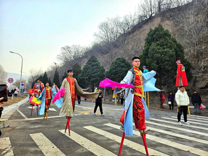 “来了来了!高跷队过来了!”伴随着阵阵喝彩,南山高跷队队员早已扮上角儿,踩着高跷稳步入场。扭踩腾挪、对舞竞技、燕子翻身……一系列高难度动作一气呵成,招式娴熟灵动,表情生动传神,将传统民俗的精气神展现得淋漓尽致。围观群众纷纷驻足观赏,拿出手机记录精彩瞬间,掌声、欢呼声与锣鼓声交织在一起,勾勒出一幅热闹非凡的迎春画卷,让大家在沉浸式体验中感受传统年俗的独特魅力。