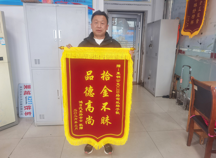 孙女士激动万分,特意送来一面写有“品德高尚 拾金不昧”锦旗,她想当面感谢杨子敬师傅,他却还在执行运营任务。“真是帮了我们的大忙,世上还是好人多啊。”孙女士哽咽着说。