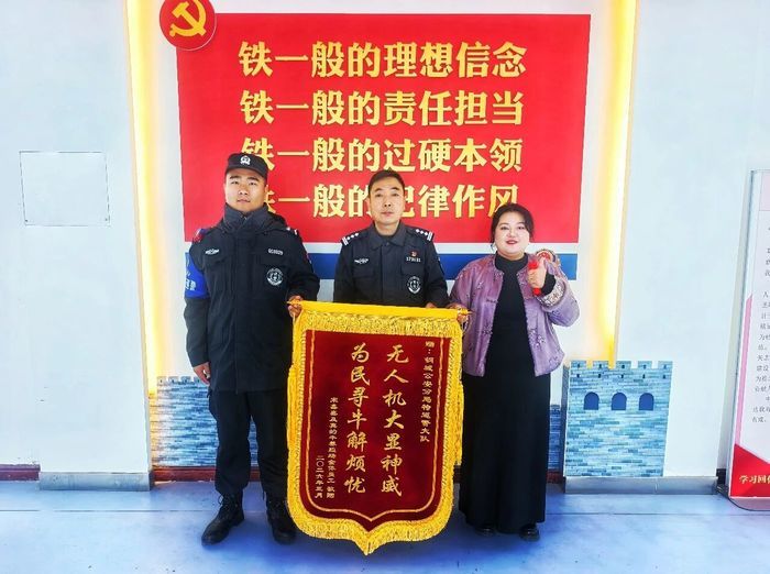3月16日,群众专程将一面印有“无人机大显神威,为民寻牛解烦忧”的锦旗送到大队,对特巡警大队快速反应、高效为民办实事的工作作风表示衷心感谢。