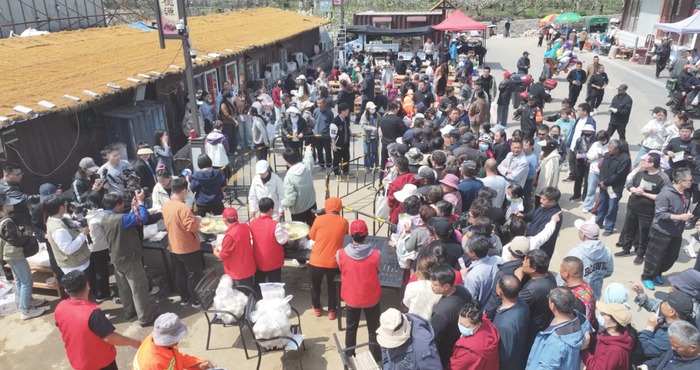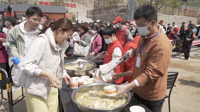 上午10时,黄花峪村美食主会场热闹非凡。本届赏花会创新推出“齐鲁第一锅请柬”打卡活动,游客在黄花峪村领取请柬后,按照指引到任意6家合作餐厅完成打卡,即可享受专属优惠,并免费品尝当日咕嘟杀猪菜。热气腾腾的杀猪菜鲜香浓郁、原汁原味,大家在浓浓烟火气中感受汶源地道风味,尽享春日舌尖美味。