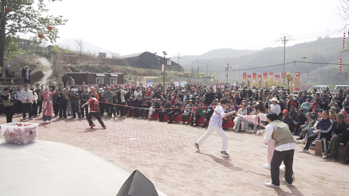 现场趣味互动精彩纷呈。在爱情公路沿线霞峰观景台,一棵盛开的巨型桃花树下挂满了粉色花环,游客与“桃小主”“桃花弓手”等进行趣味互动,参与桃花弓射箭游戏,赢取定制冰箱贴等精美礼品,拍照打卡、乐趣十足;双人趣味“村拔”活动热闹开赛,游客两两一组、齐心协力,在欢声笑语中比拼力量、增进情谊,成为现场一道欢乐风景线。