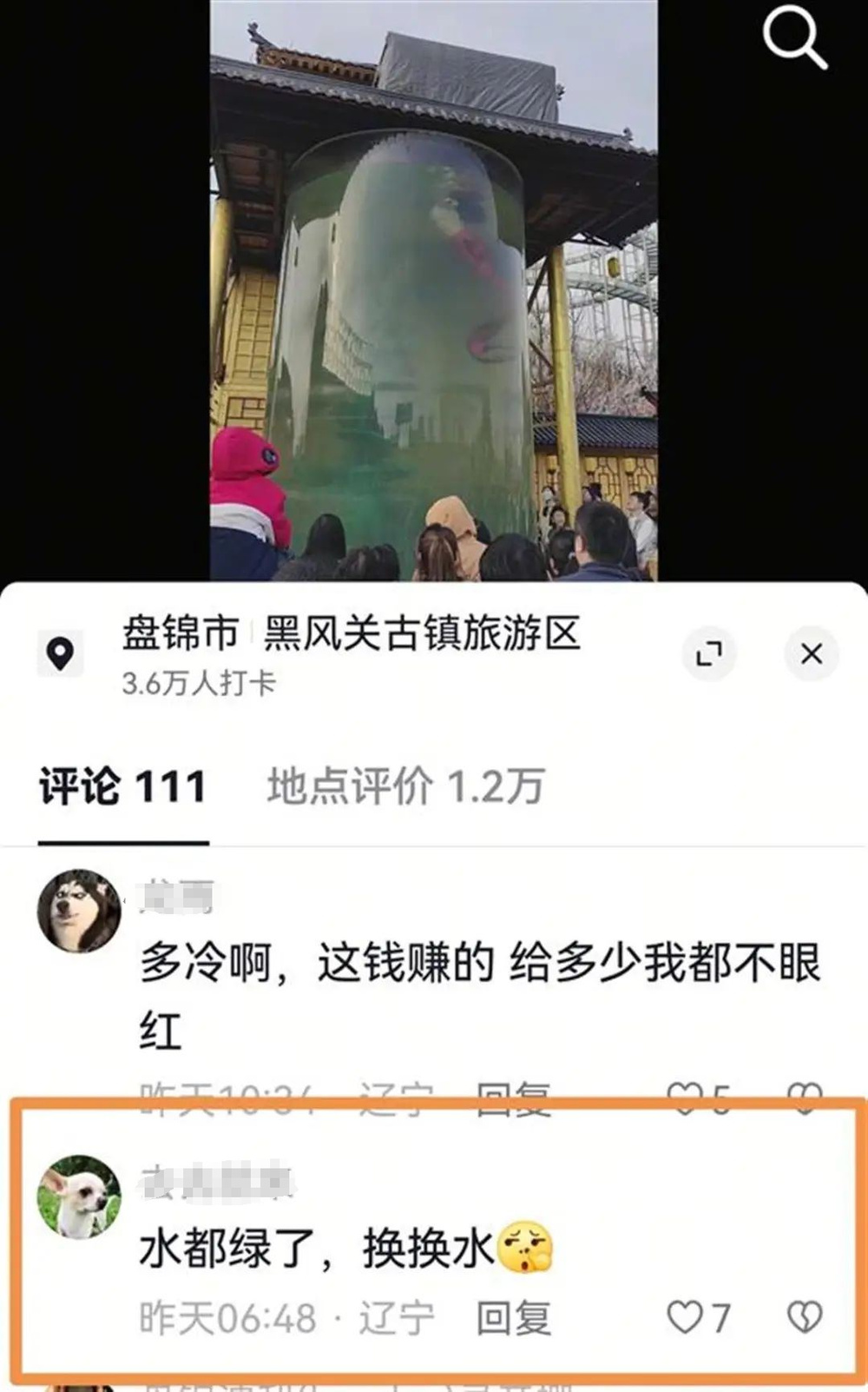 谁能想到,本该是童话照进现实的美人鱼表演,却在浑浊发绿的水缸里演变成一场视觉灾难。近日,有网友发视频吐槽辽宁省盘锦市黑风关古镇的美人鱼表演项目。视频内,缸内的水泛绿、浑浊,网友评论:“臭水沟的水吧,这么浑?”“水不臭吗?”“这鱼出来不得中毒?”对此,景区回应称,水缸的过滤系统突然坏了。但因为票已经卖出了,所以表演还要继续进行。