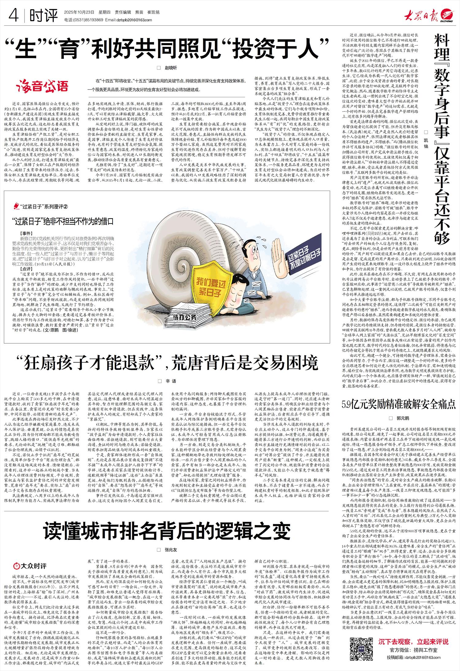 “投资于人”的价值,不仅体现在稳定人口总体规模预期上,更体现在提升人口质量、为未来蓄力上。今天对育儿家庭的每一份投入,实际上都连接着明天的人口红利与人才红利。在“十四五”即将收官、“十五五”谋篇布局的关键节点,持续完善并深化生育支持政策体系,一个服务更具品质、环境更为友好的生育友好型社会必将加速建成,为应对世界百年未有之大变局积蓄人力资源优势,为中国式现代化提供最磅礴的内生动力。