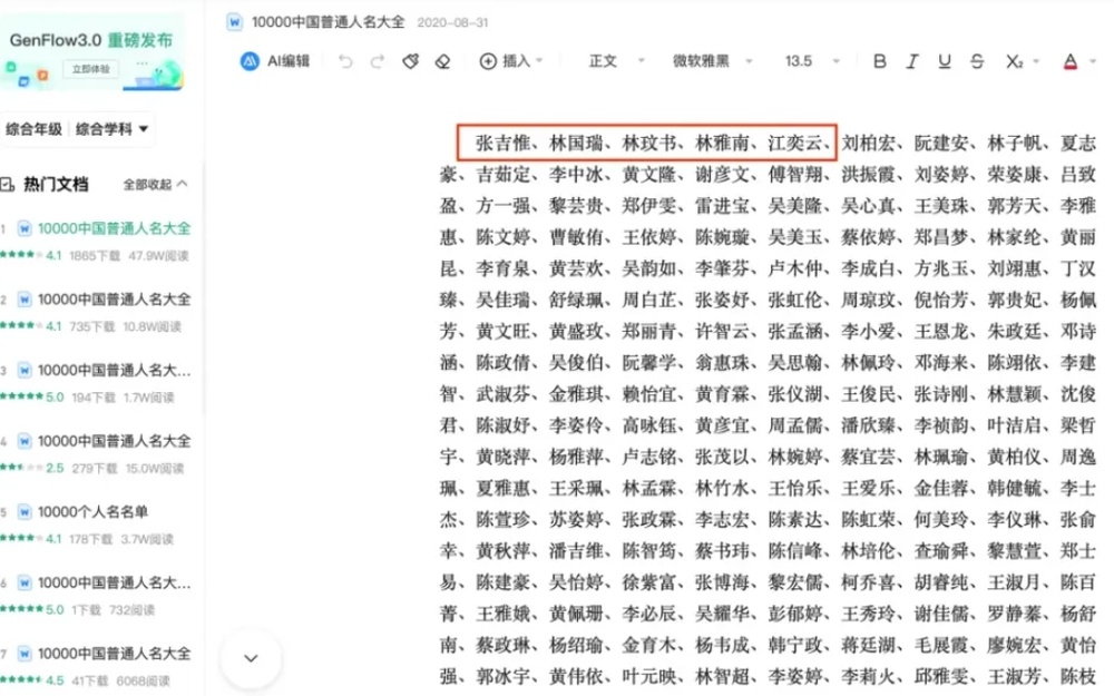 这两天,百度文库《10000中国普通人名大全》中“张吉惟、林国瑞、林玟书、林雅南、江奕云”五人的名字,被曝频繁出现在采购评审、比赛获奖名单、行政处罚公示等不同场景,引发舆论对公共事务造假的质疑,这五人也被称为“全网最忙五人组”。