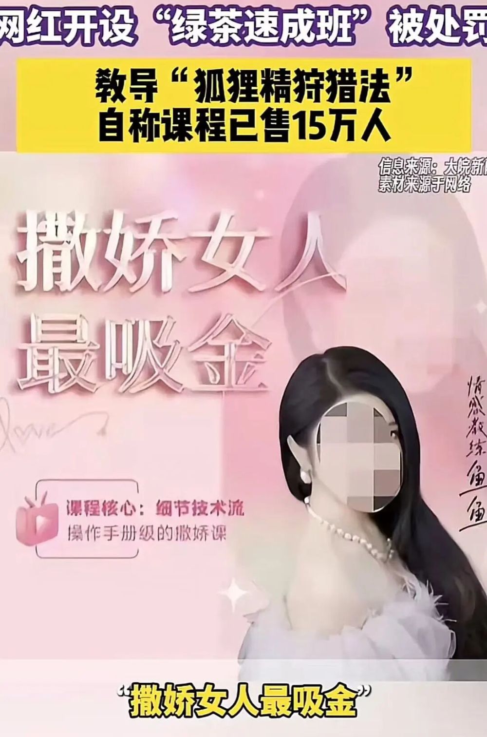 演都不演了,直接就叫“绿茶速成班”。这类课程就是打着“情感速成班”的名义捞钱,通过所谓眼神、话术、肢体动作操控异性,看似在帮女性“掌握主动权”,实则是把女性物化为依附男性的工具。