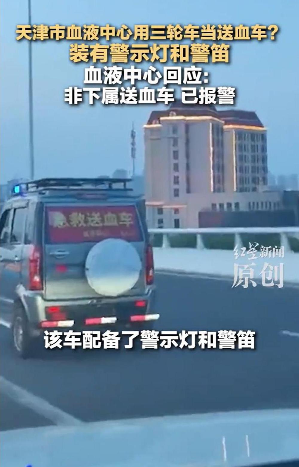 日前,天津有网友拍到一辆三轮车在道路上疾驰,与众不同的是,该车配备了警示灯和警笛,还贴有“急救中心送血车”字样。多位网友在评论区表示,该车辆经常出现在天津街头。