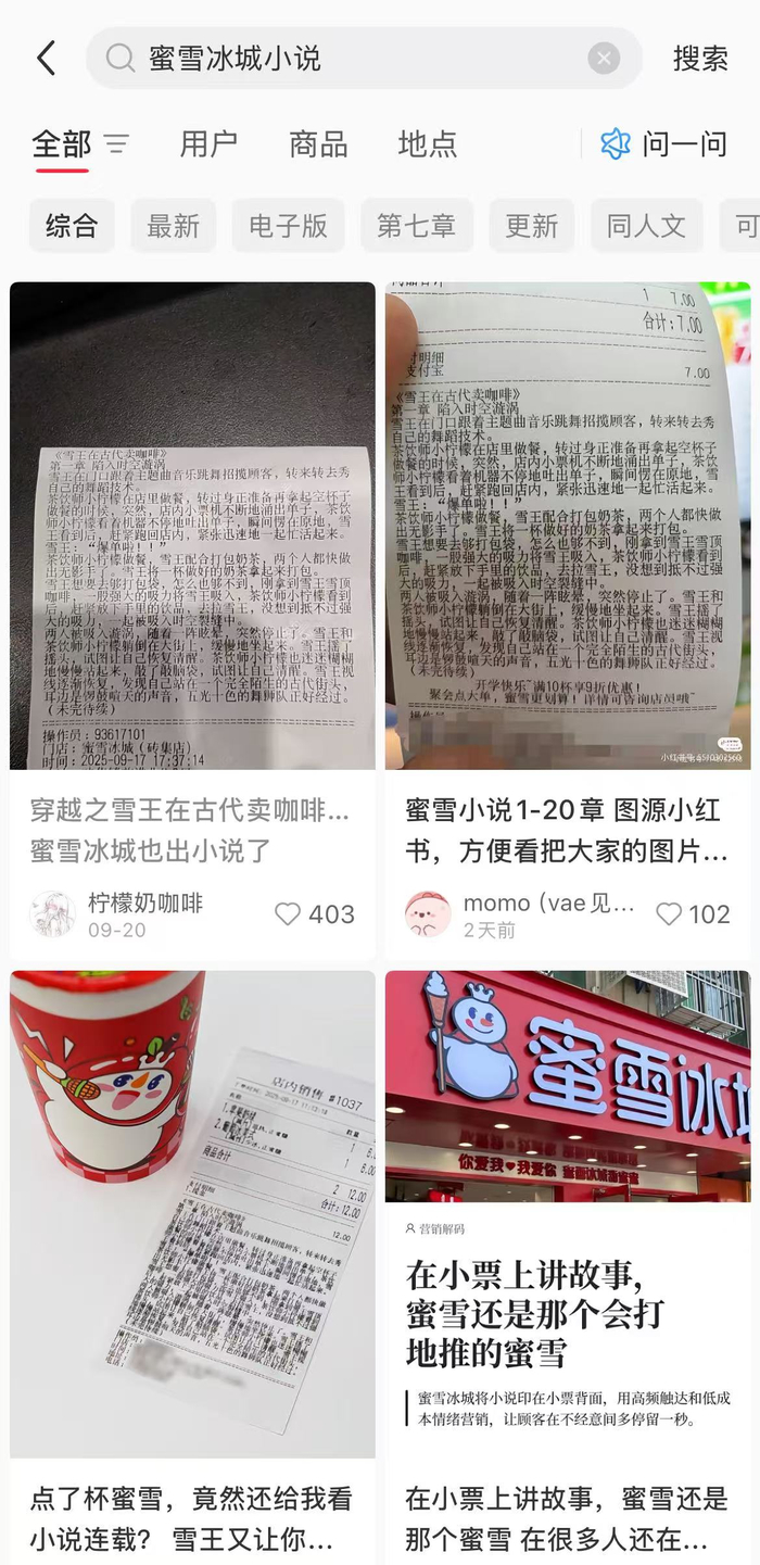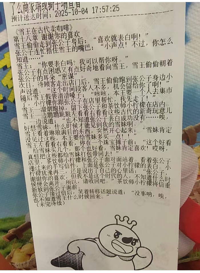 “当时拿到小票愣了一下,看到订单信息下面还有很长的几行字,还以为是印错了。”一位蜜雪冰城消费者告诉记者,“仔细一看,居然是一篇小说,写的是穿越题材,情节还挺上头,我为了看后续,连着几天都买了它家的奶茶。”像她这样的消费者不在少数,社交平台上,大量用户晒出自己收到的小票小说,也有不少用户发帖求某一章节的小票。