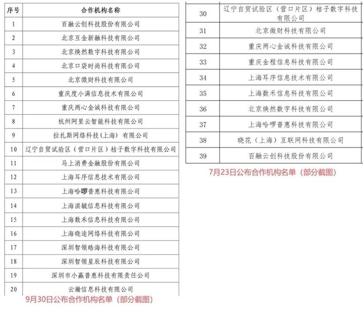合作机构名单涵盖了平台运营机构、增信服务机构以及催收服务机构。与今年7月份公布的合作机构名单相比,哈银消费金融的最新合作机构数量明显增加,由39家增至68家。