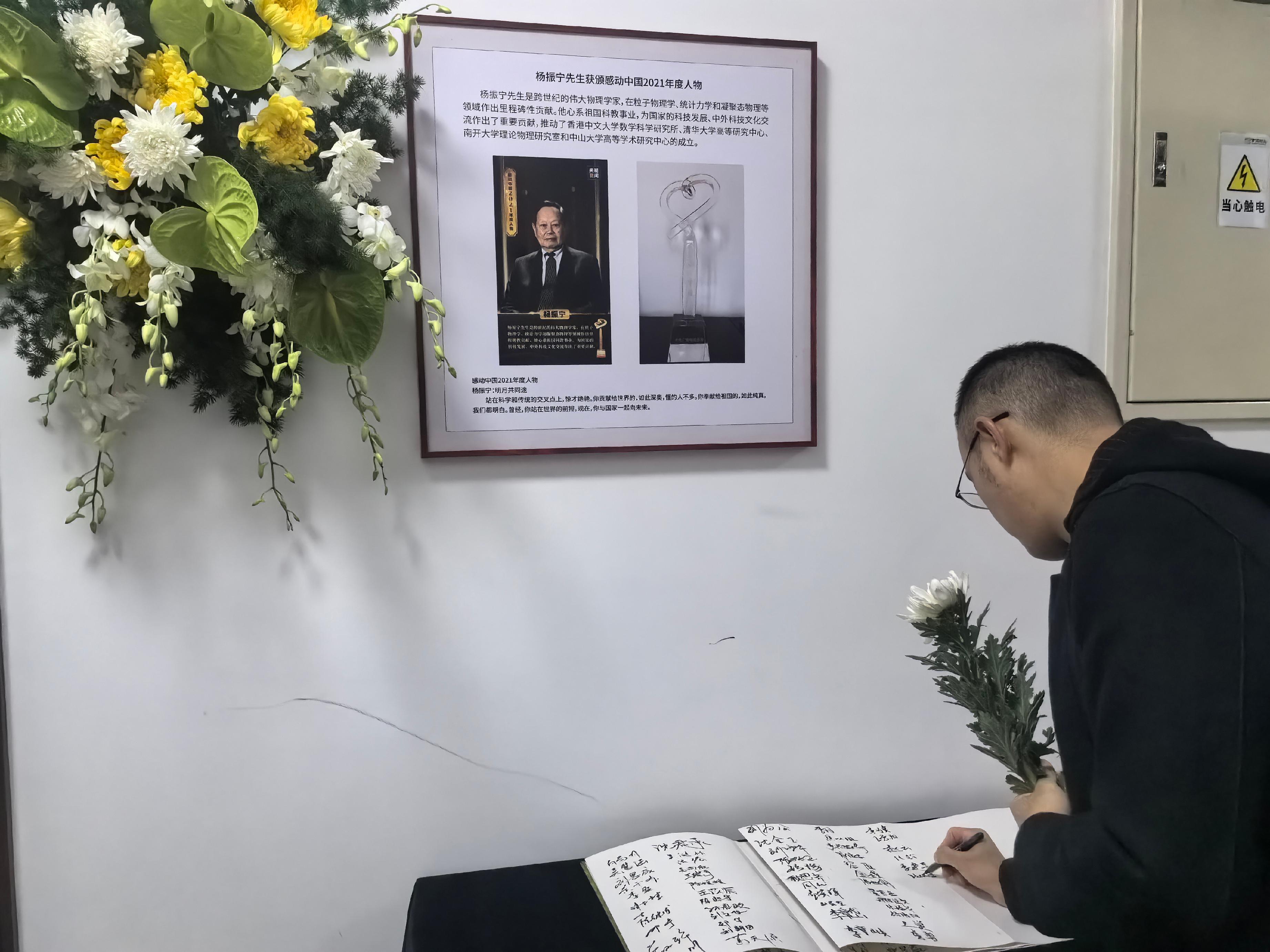 一位在美国工作的物理学学者前两天刚好回国,10月19日就和朋友们一起来缅怀室悼念杨振宁。1999年,他在中国科学院高能物理所求学期间,杨振宁在清华大学高能研究院开设了为期两周的学习班,并为清华大学物理系和高能物理研究所的研究生上了一节45分钟左右的导论课,这位学者是听课者之一。