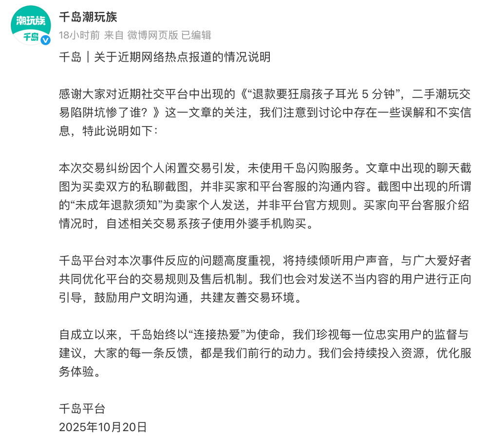 千岛表示,文章中出现的聊天截图为买卖双方的私聊截图,并非买家和平台客服的沟通内容。截图中出现的所谓“未成年退款须知”为卖家个人发送,并非平台官方规则。买家向平台客服介绍情况时,自述相关交易系孩子使用外婆手机购买。