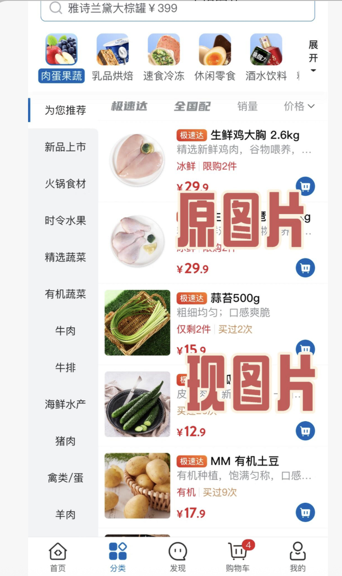 牛肉成为图片更换的“重灾区”。用户抱怨:“牛肉图片最夸张,明明卖的生牛肉,照片都是一盆盆摆盘精致的炒牛肉。愣了几秒,没反应过来。”