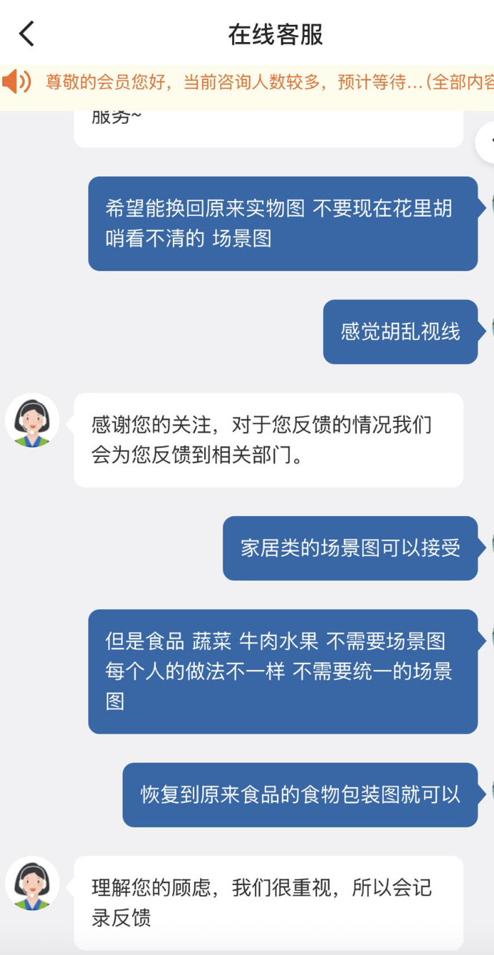 在被问及是否有其他类似反馈时,该客服代表回应“暂时没有”,并补充说,虽然自己也在山姆App上购物,但“个人来讲的话是可以接受的。其实也可以清晰看到要购买的东西,也没有太多去在意这些”。客服详细记录了用户诉求,并表示会反馈给“相关处理部门”。